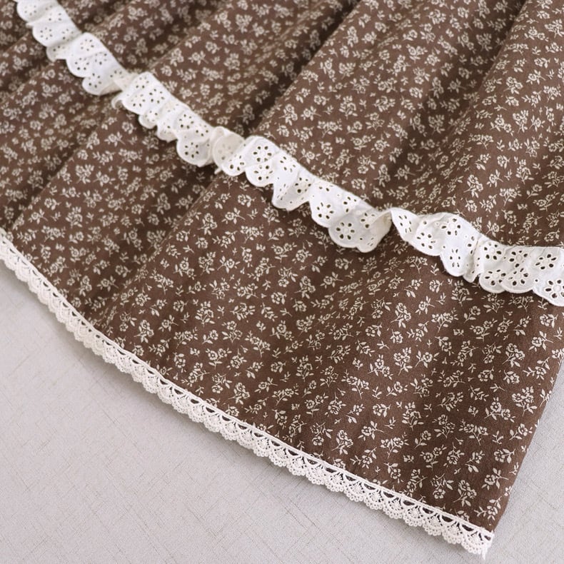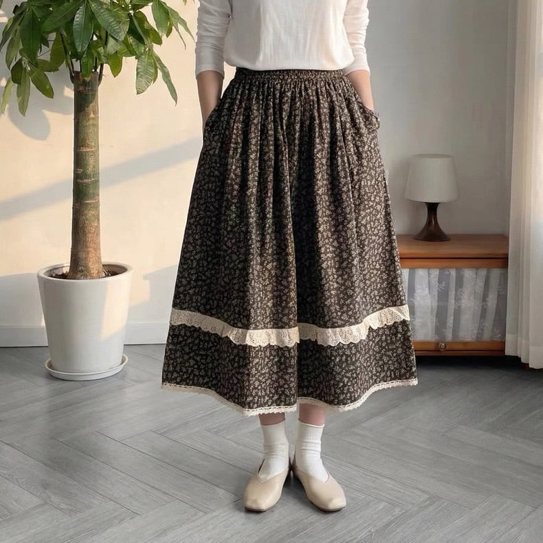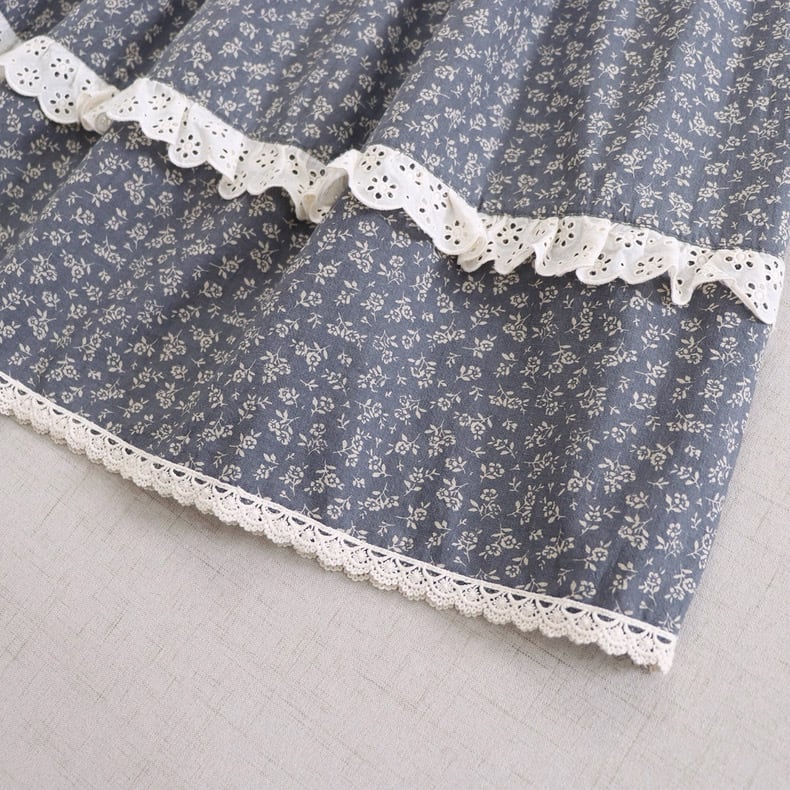 落ち着いた色味に、裾と切替部分のカットワークレースがアクセント。甘くなりすぎず、大人のナチュラルカントリースタイルにちょうどいい一枚です。