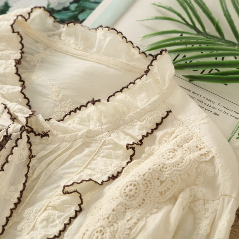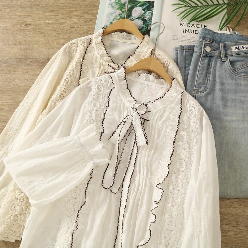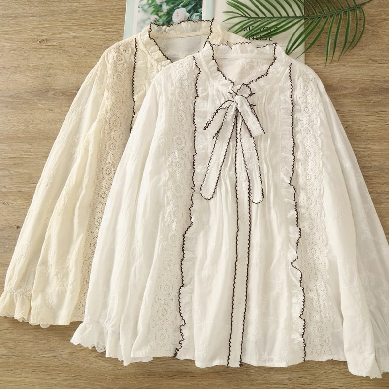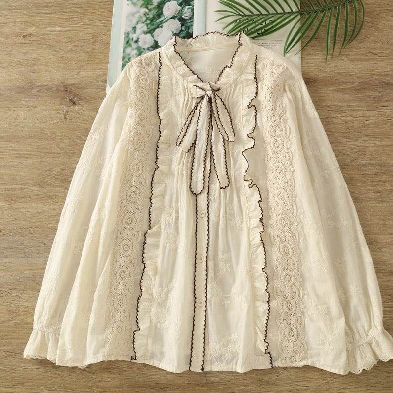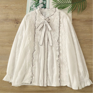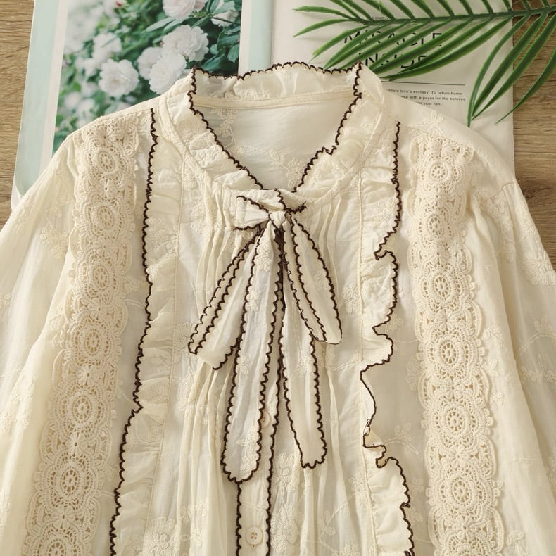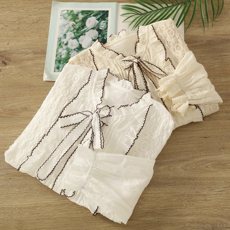 総刺繍生地に、配色ラインを効かせたブラウス。