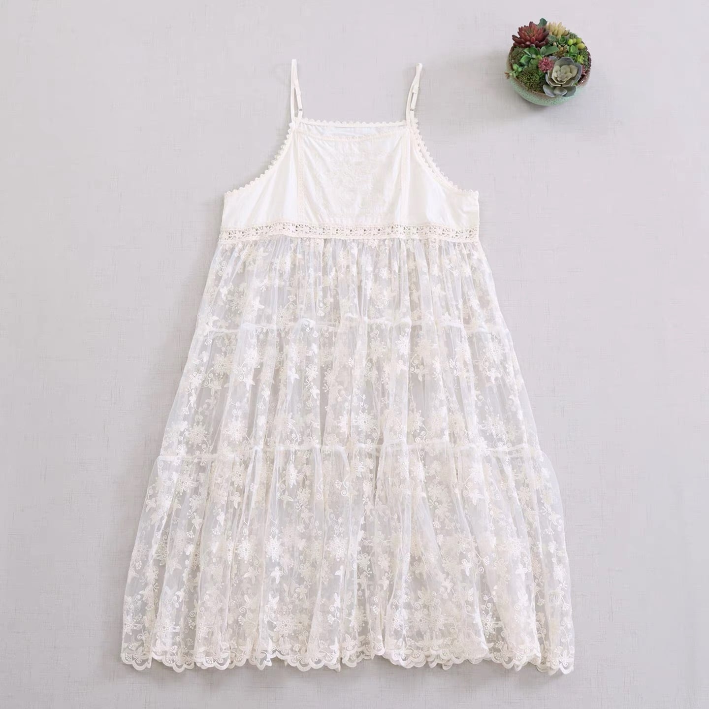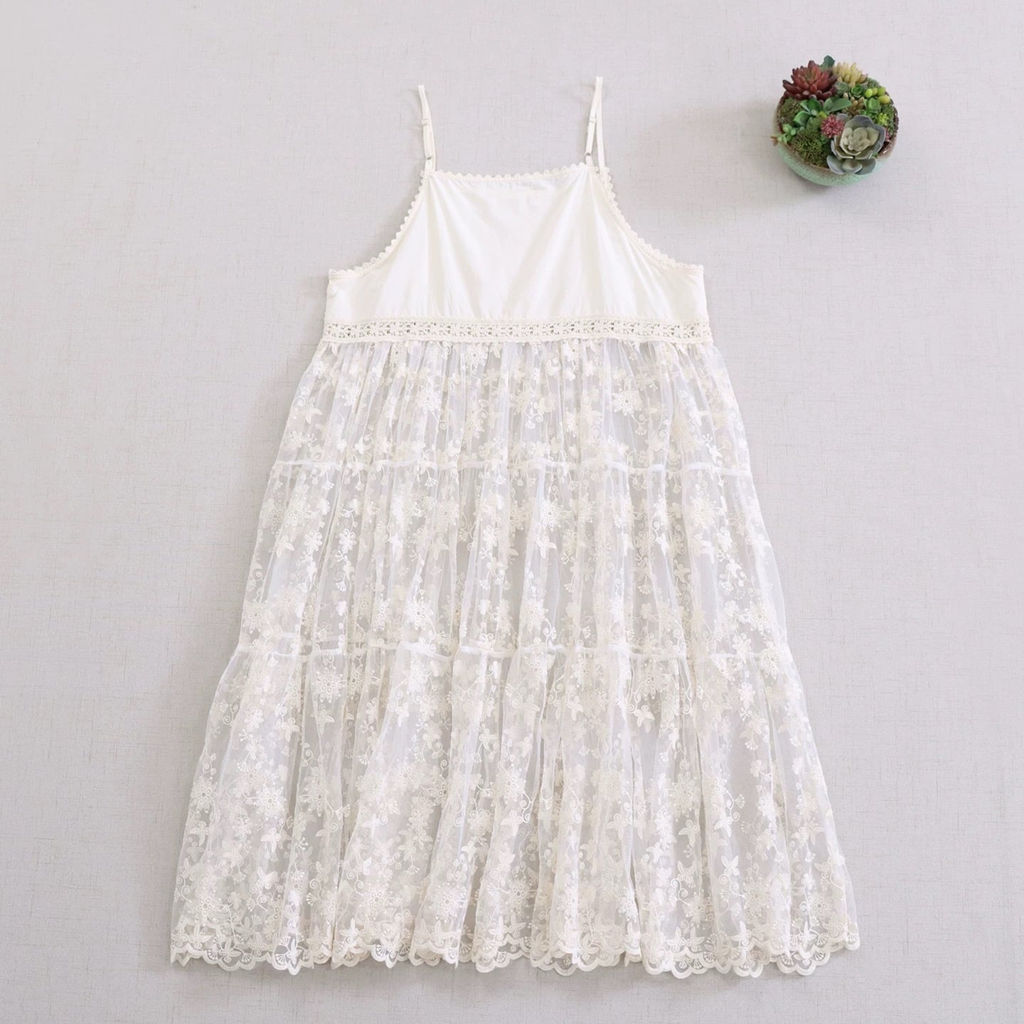 花柄レースを重ねたティアードデザインのキャミワンピース。