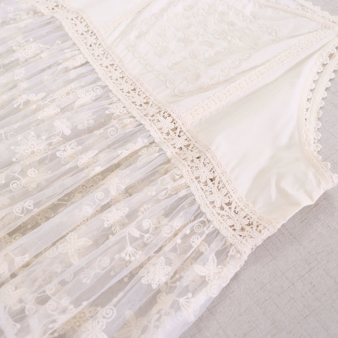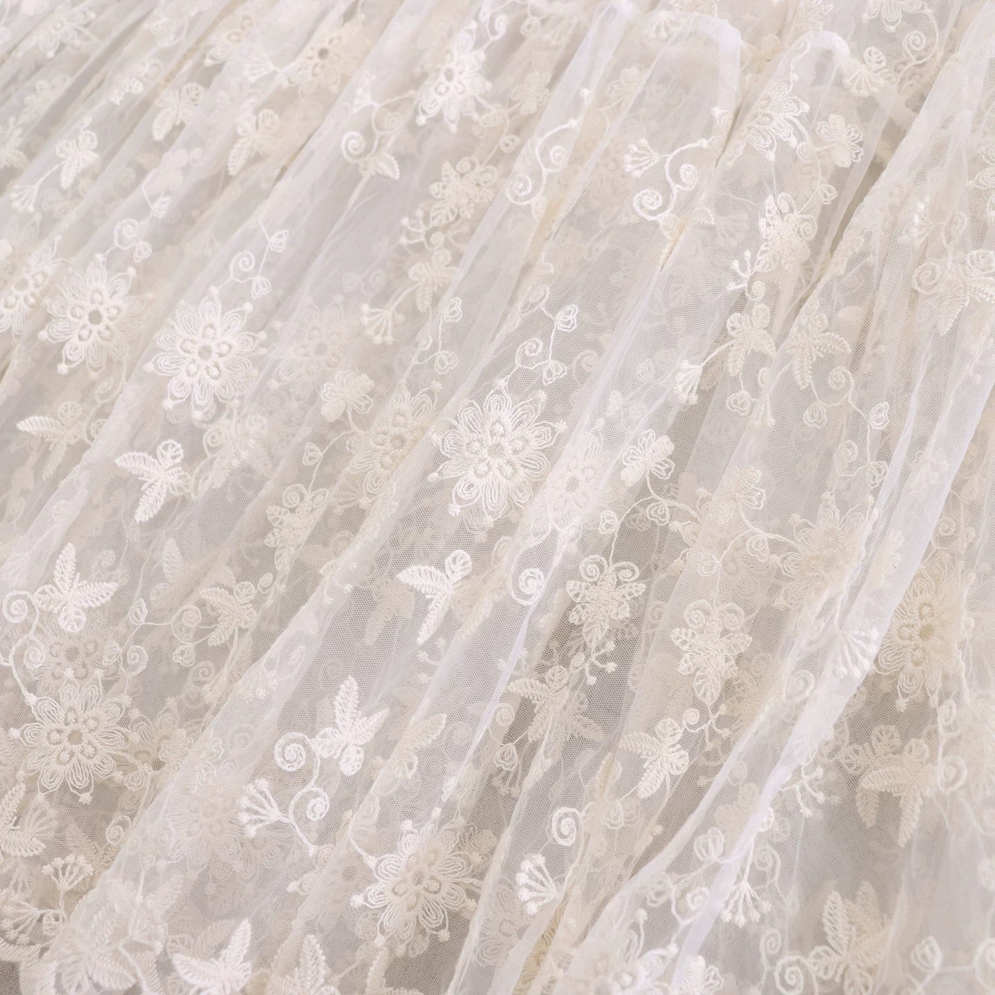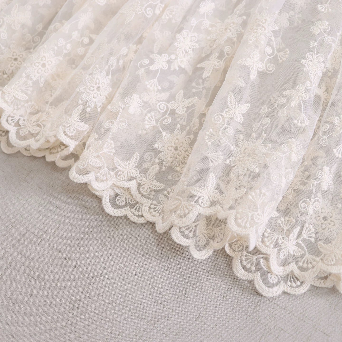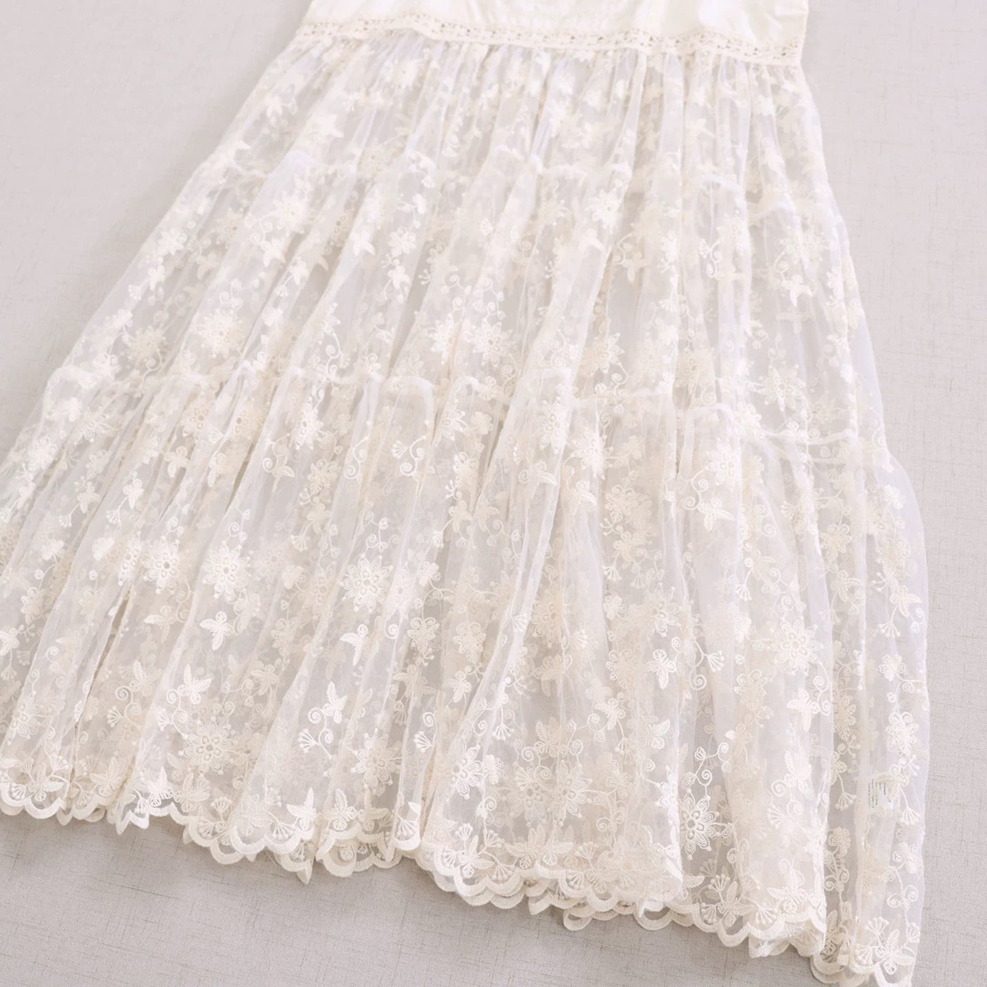 ウエスト下からティアード切り替えになっており、レースの柄が重なりながら広がるデザインです。