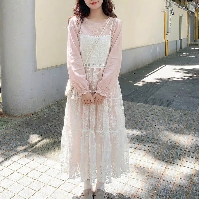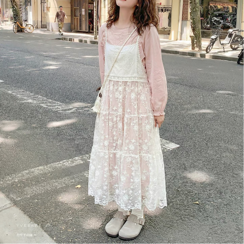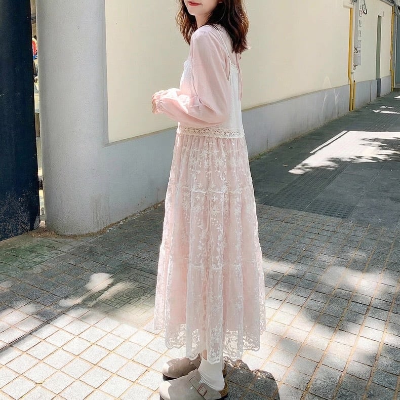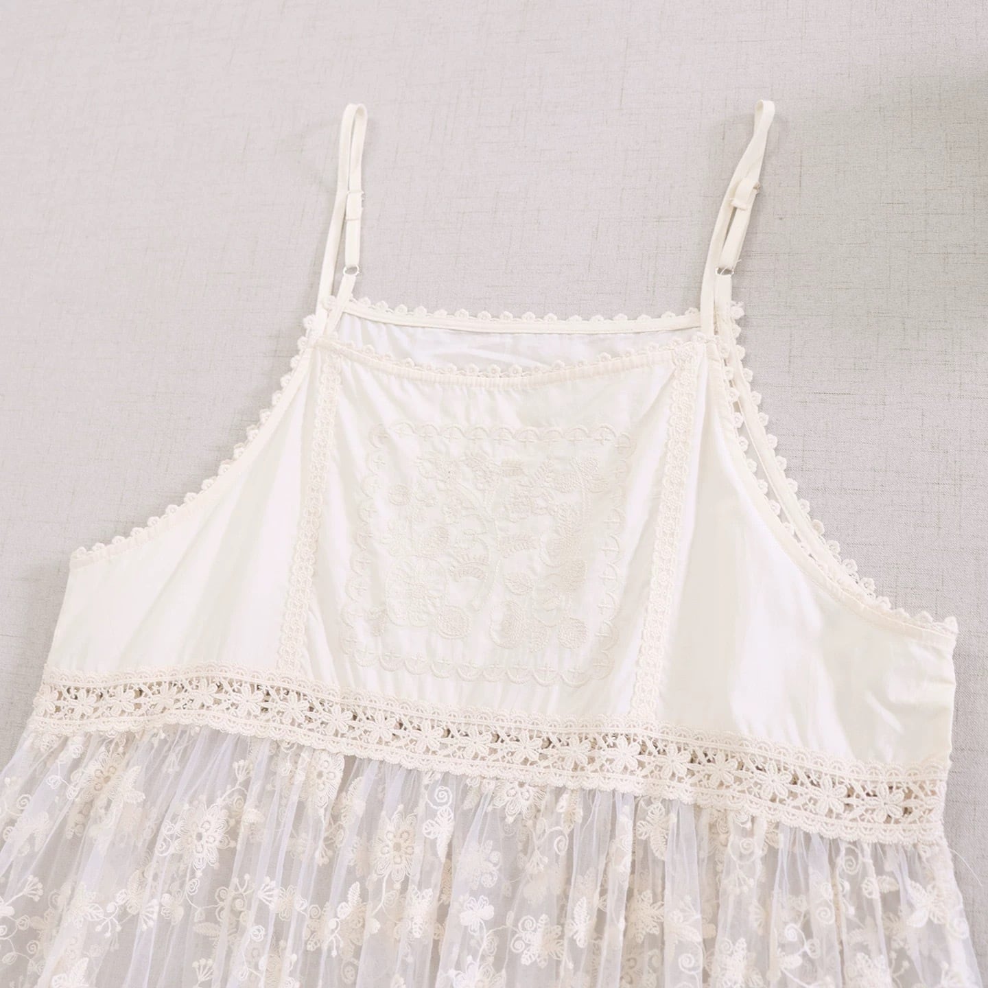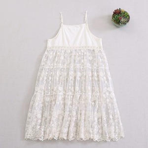 フロント刺繍花柄レース ティアードキャミワンピース fu0974