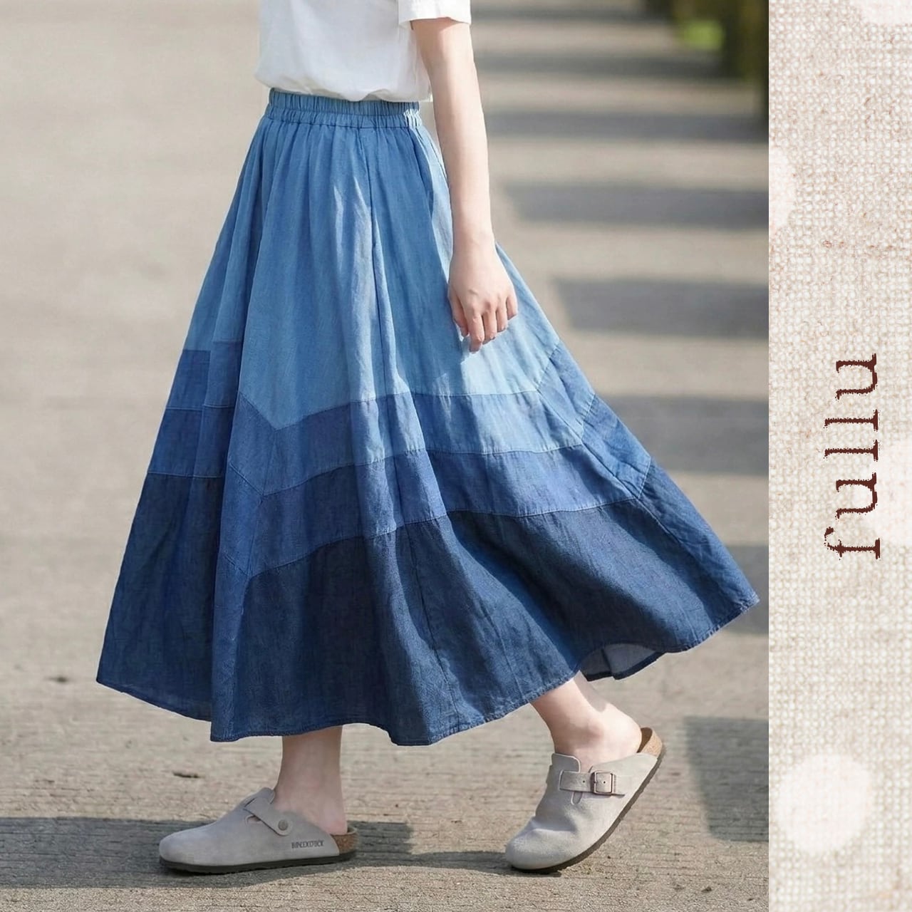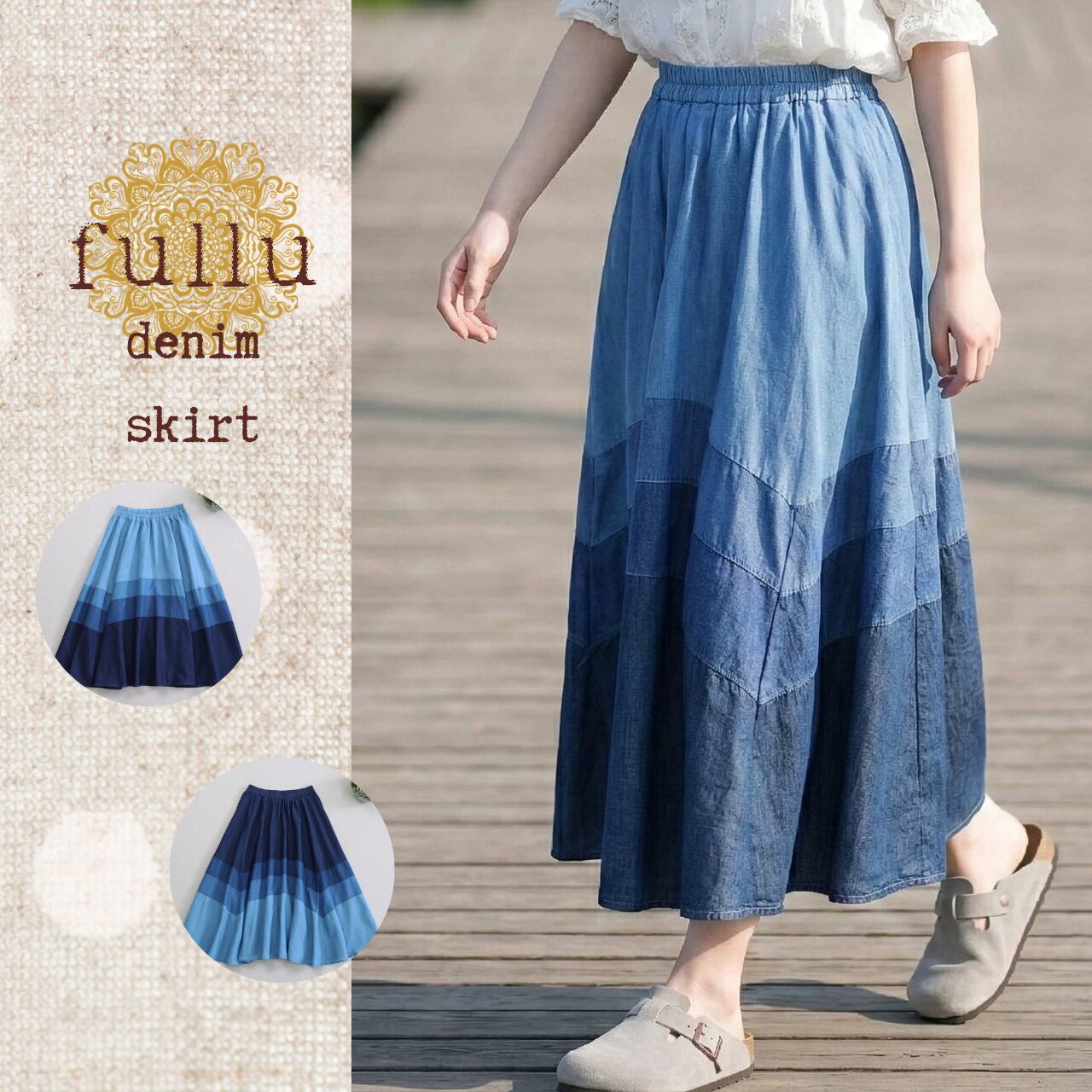 3色のデニム生地を贅沢に切り替えた、表情豊かなロングスカートです。