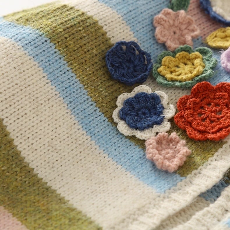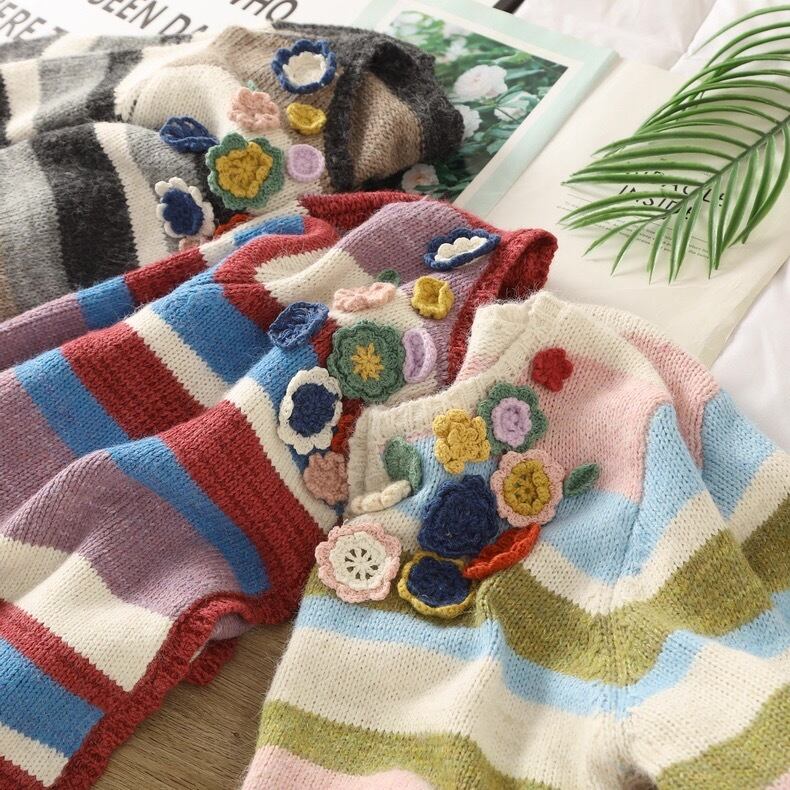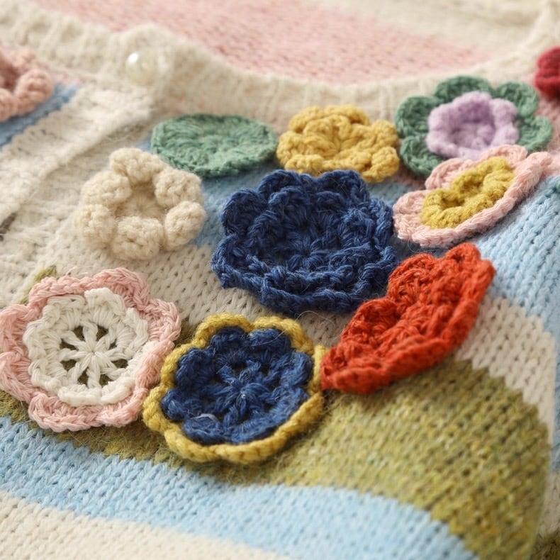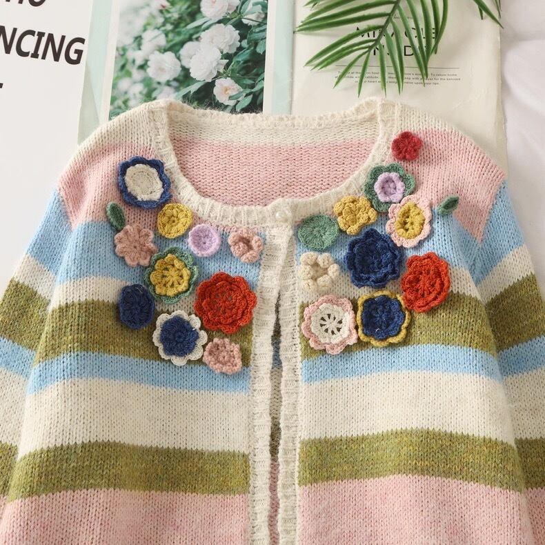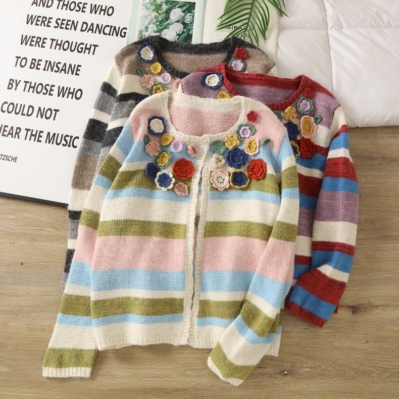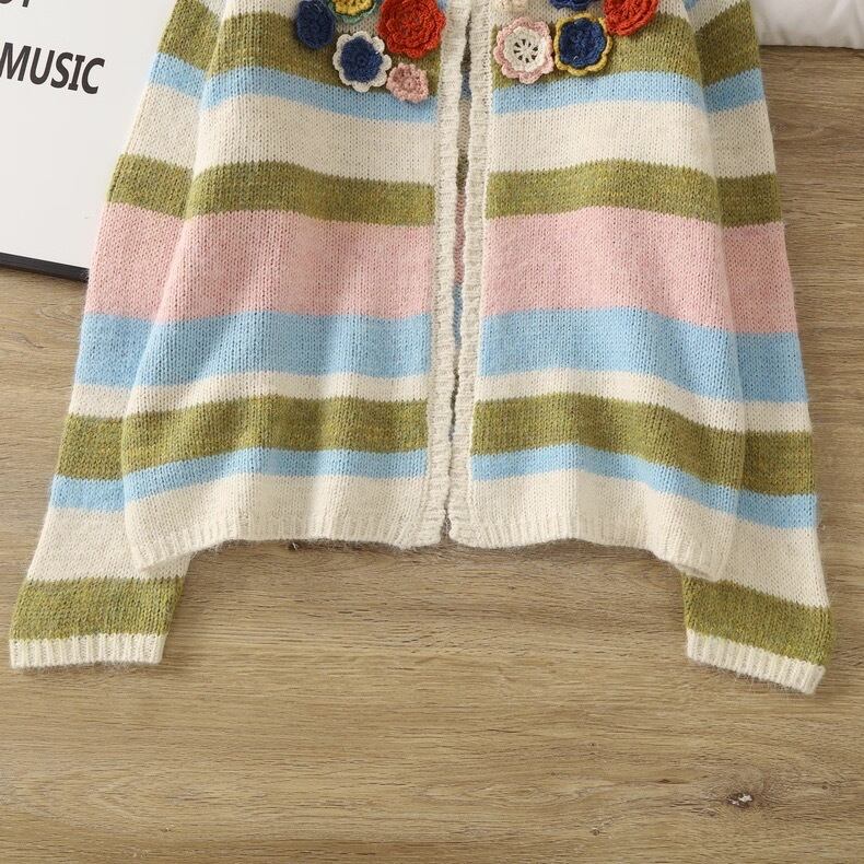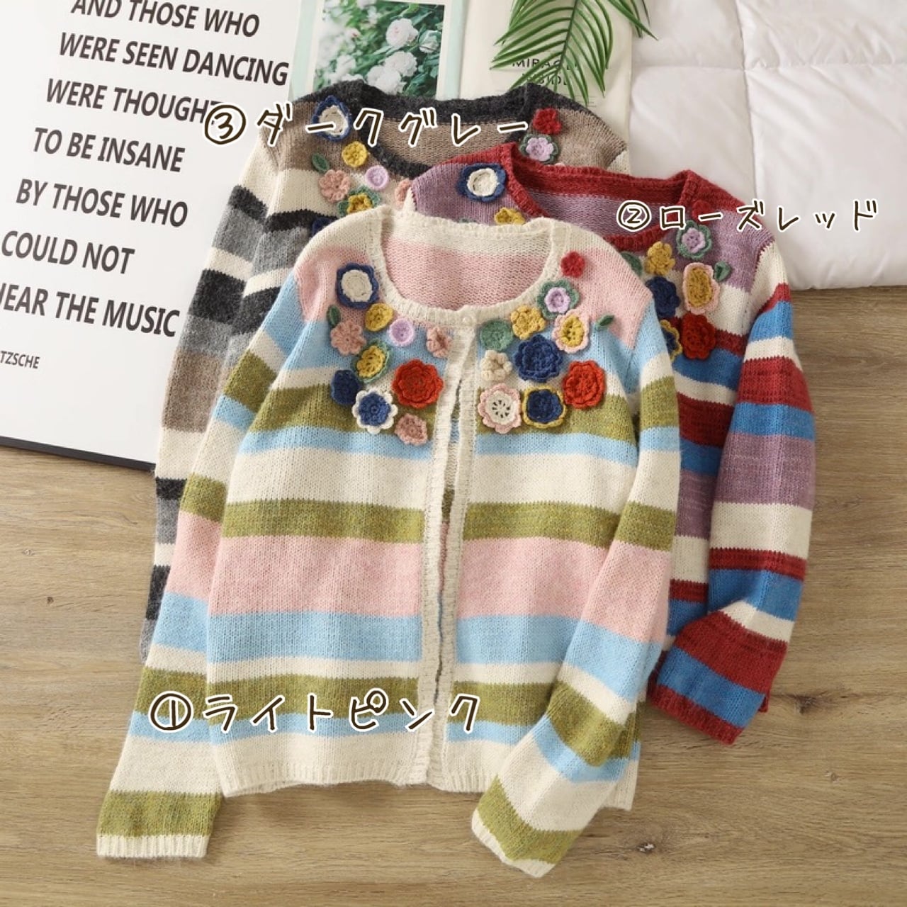 立体フラワーモチーフ カラーボーダー ニットカーディガン 3color fu0984