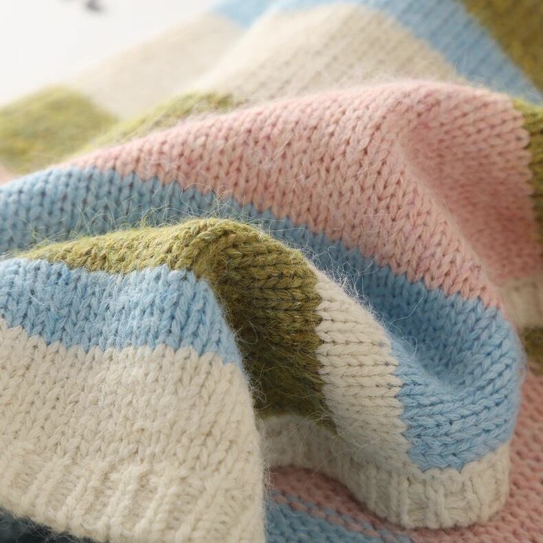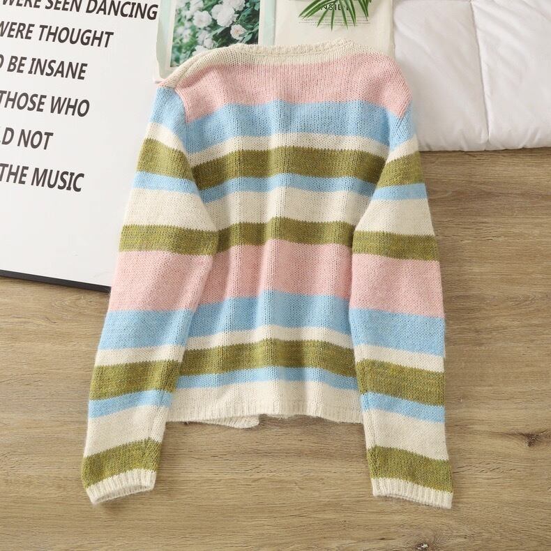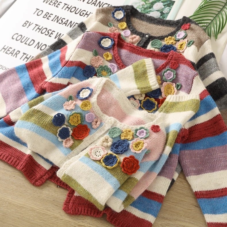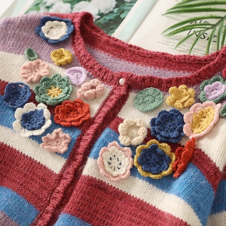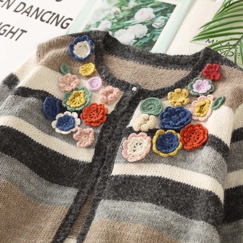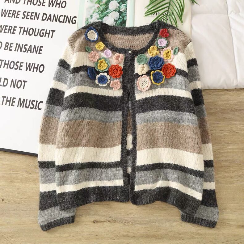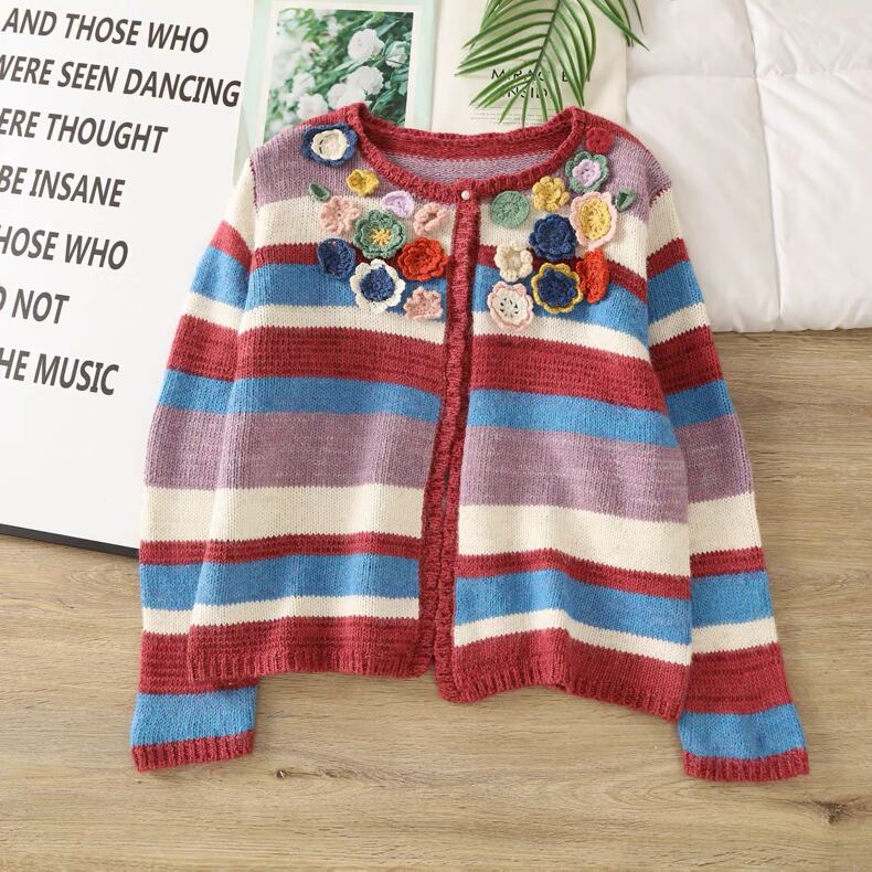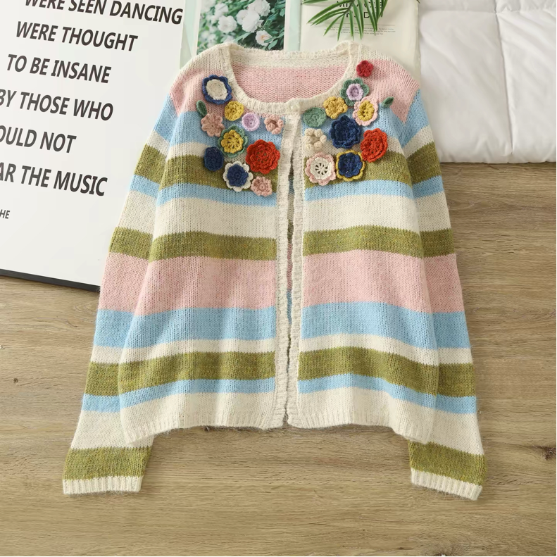 立体フラワーモチーフ カラーボーダー ニットカーディガン 3color fu0984