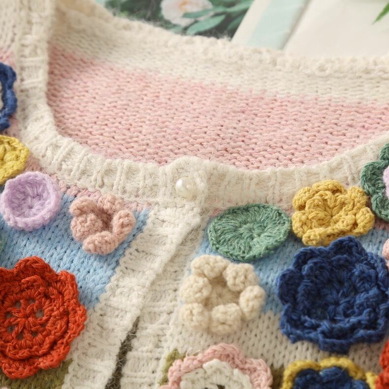 首元に立体的にあしらわれたフラワーモチーフが目を引くニットカーディガン。