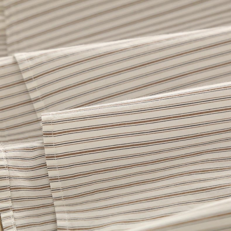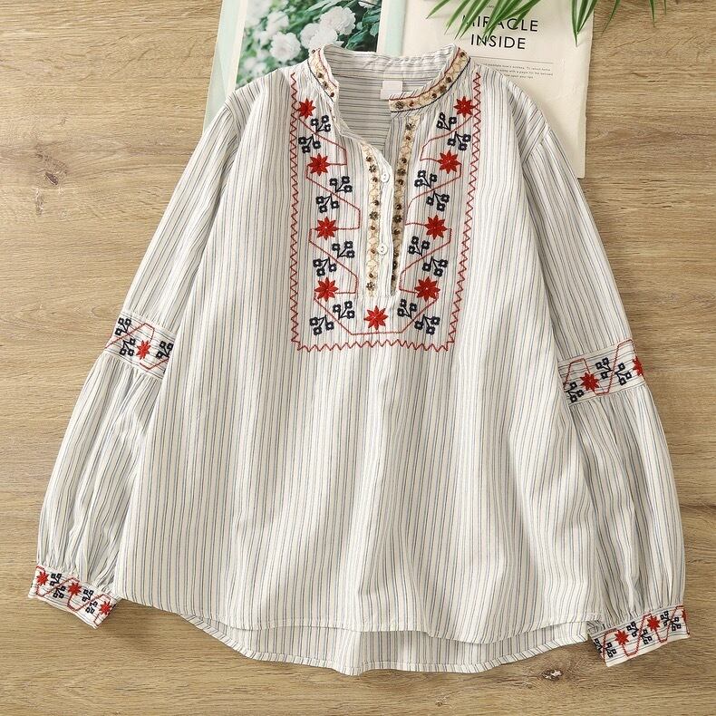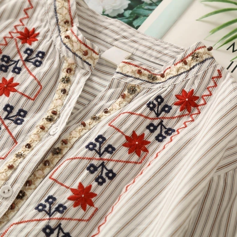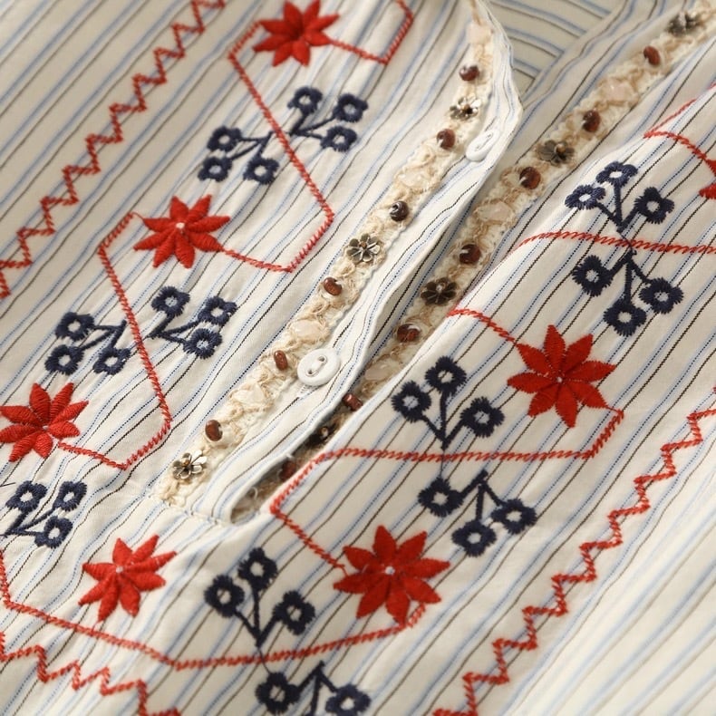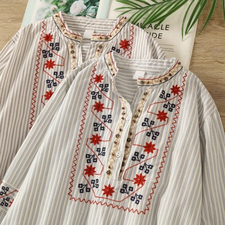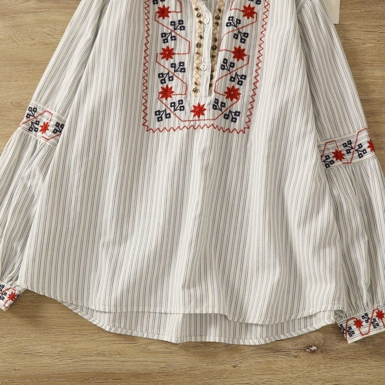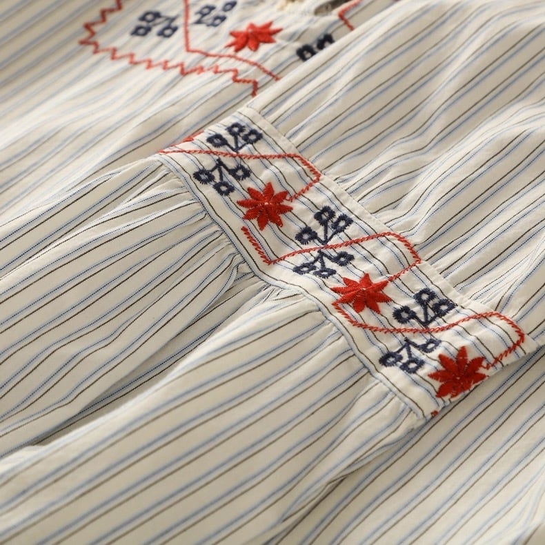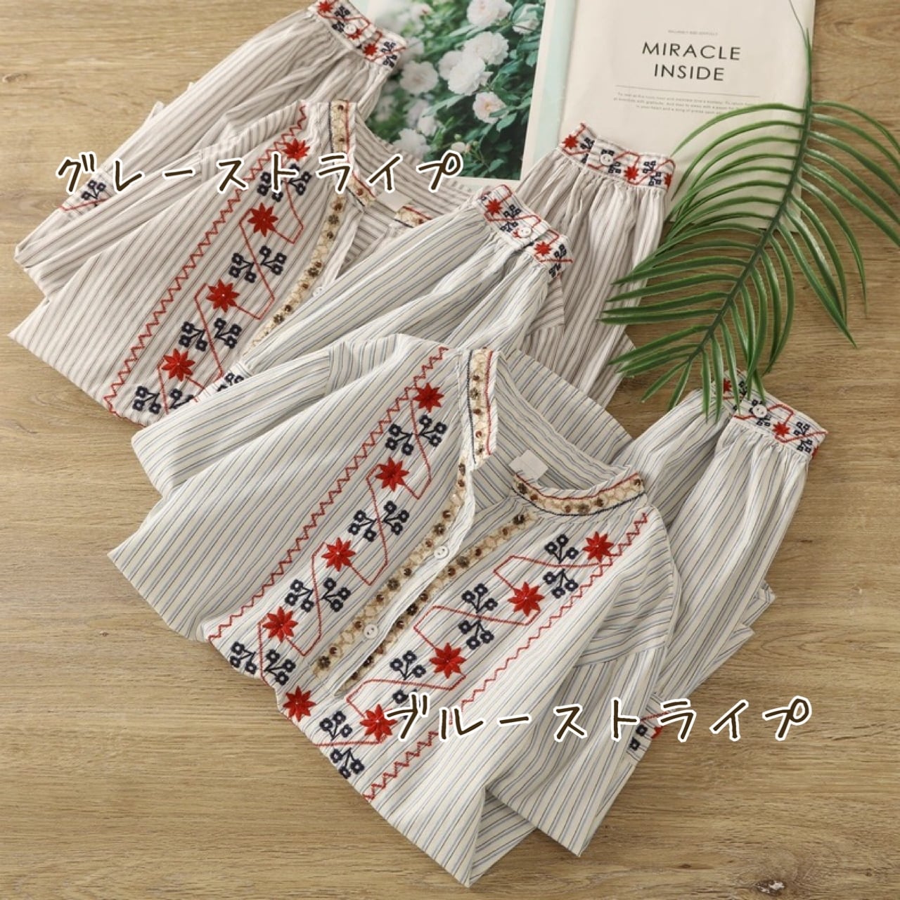 縦ラインのストライプに、フロントの刺繍がさりげなく入ったブラウスです。