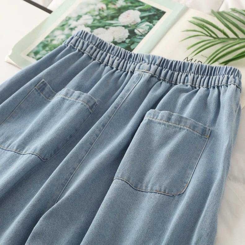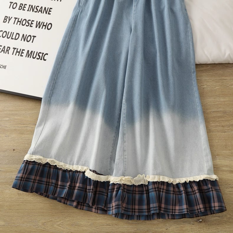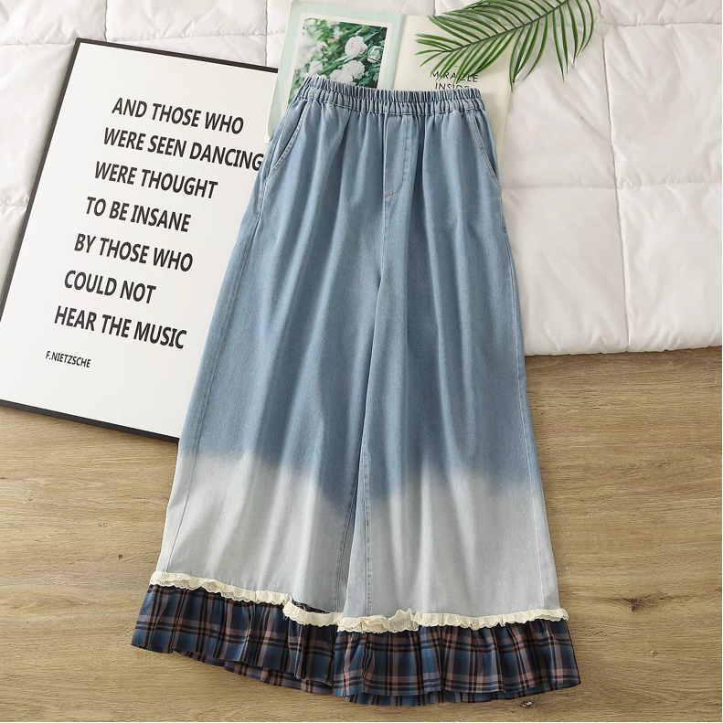 裾にかけて淡く色が変わるグラデーションに、チェック柄の切替を重ねたデニムスカート。動いたときにちらっと見える裾のディテールが、コーデにさりげないポイントをつくります。