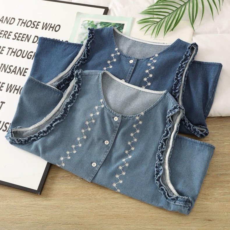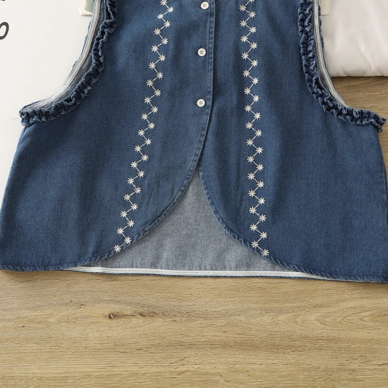 フロントに施された花刺繍が印象的なデニムベスト。