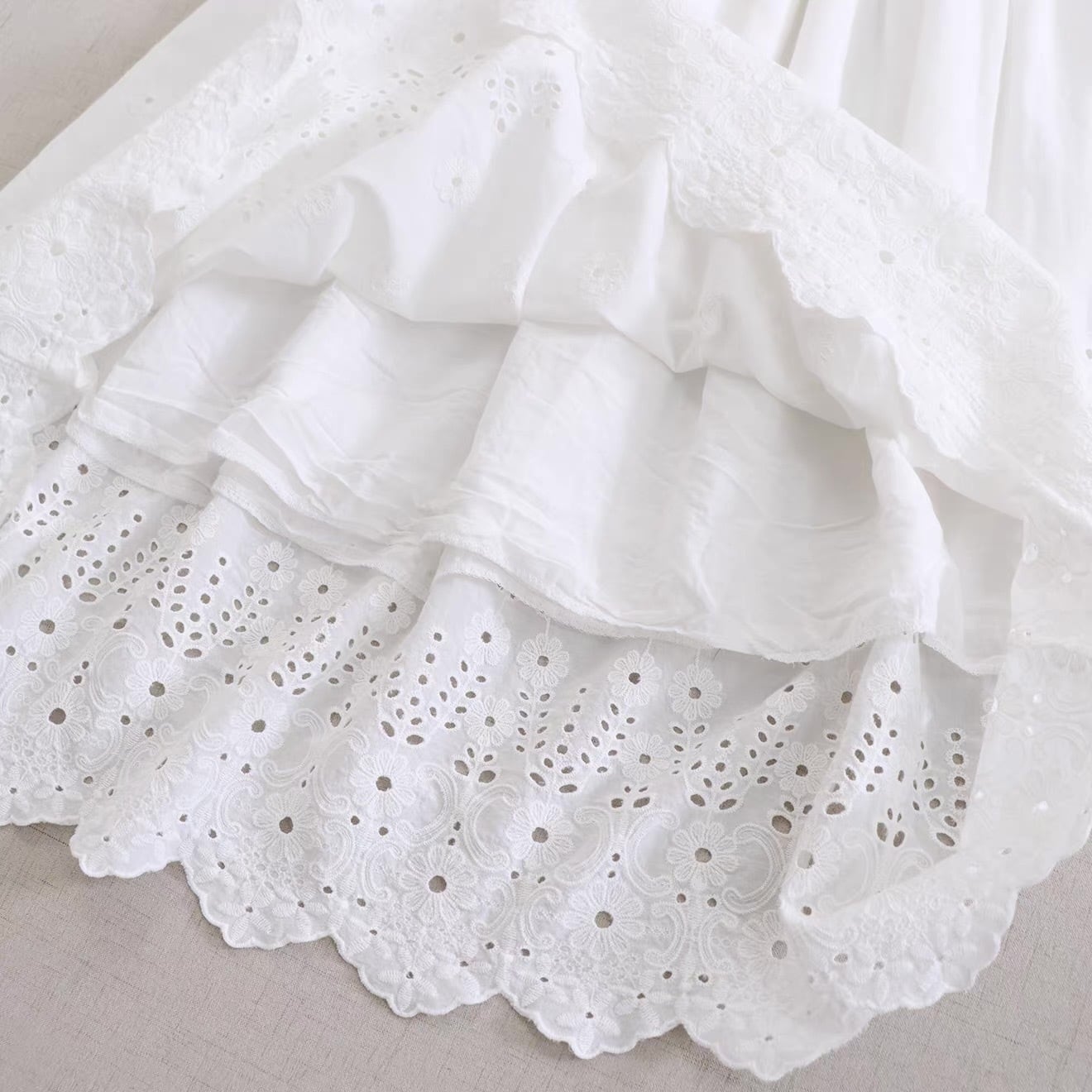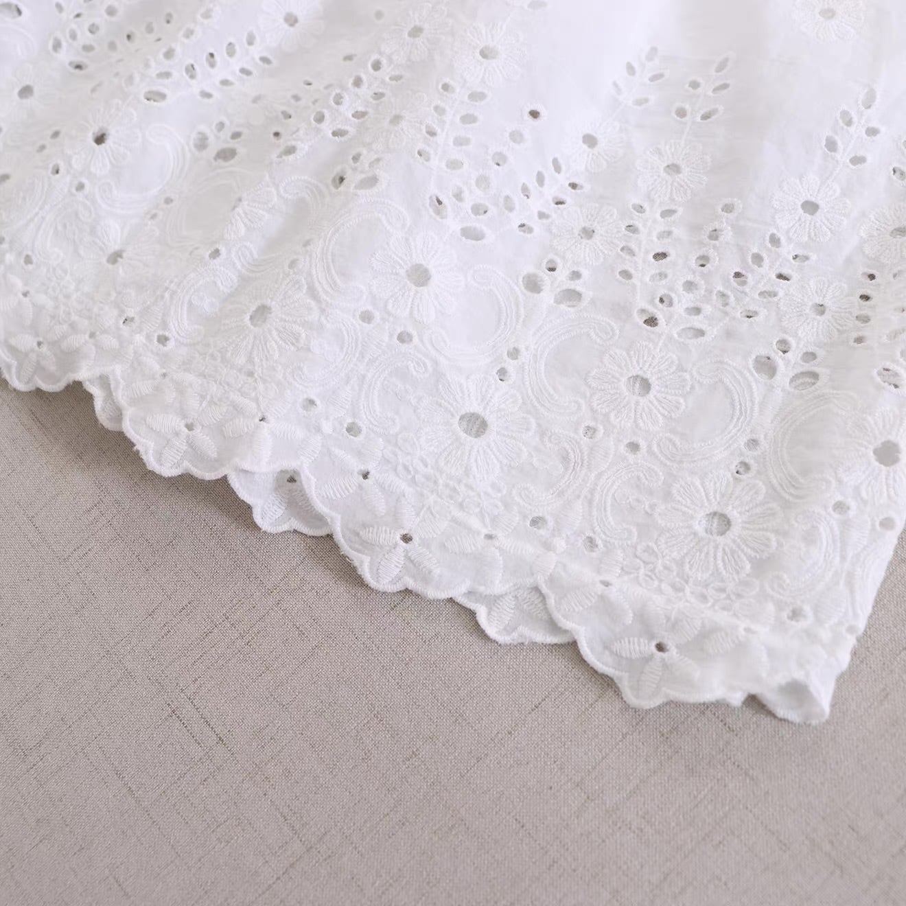 裾にあしらわれたカットワーク刺繍が目を引く、コットン素材のペチスカート。