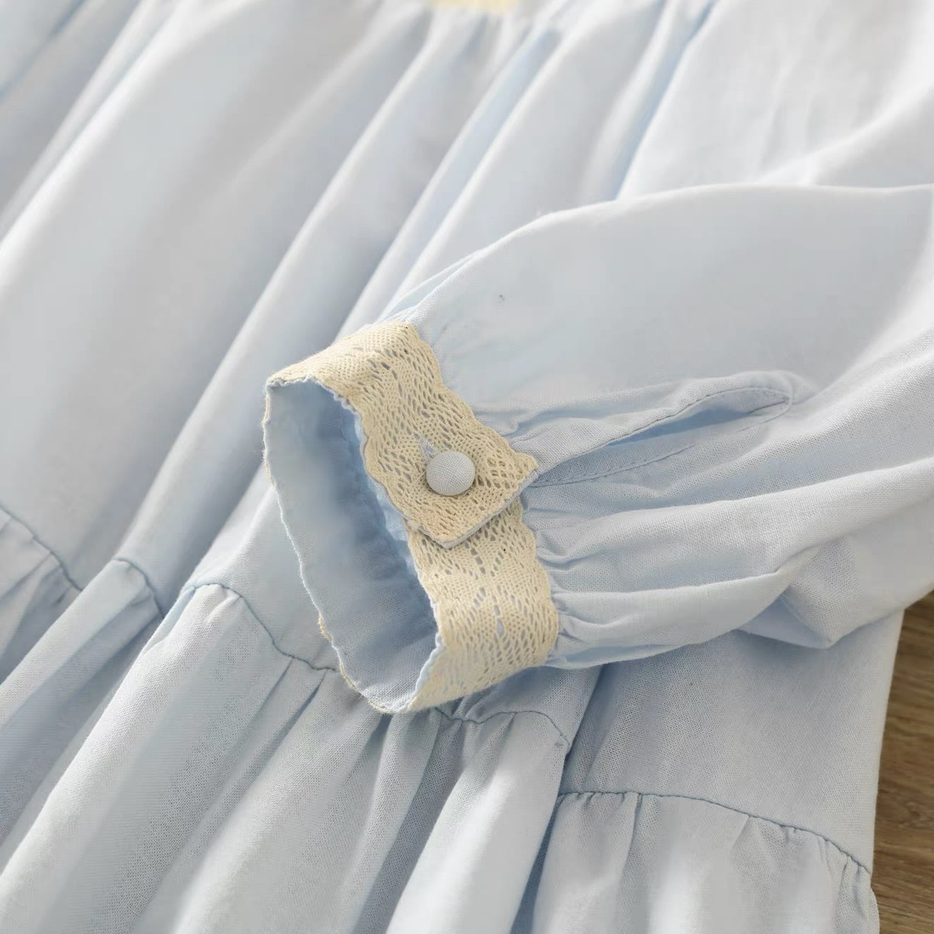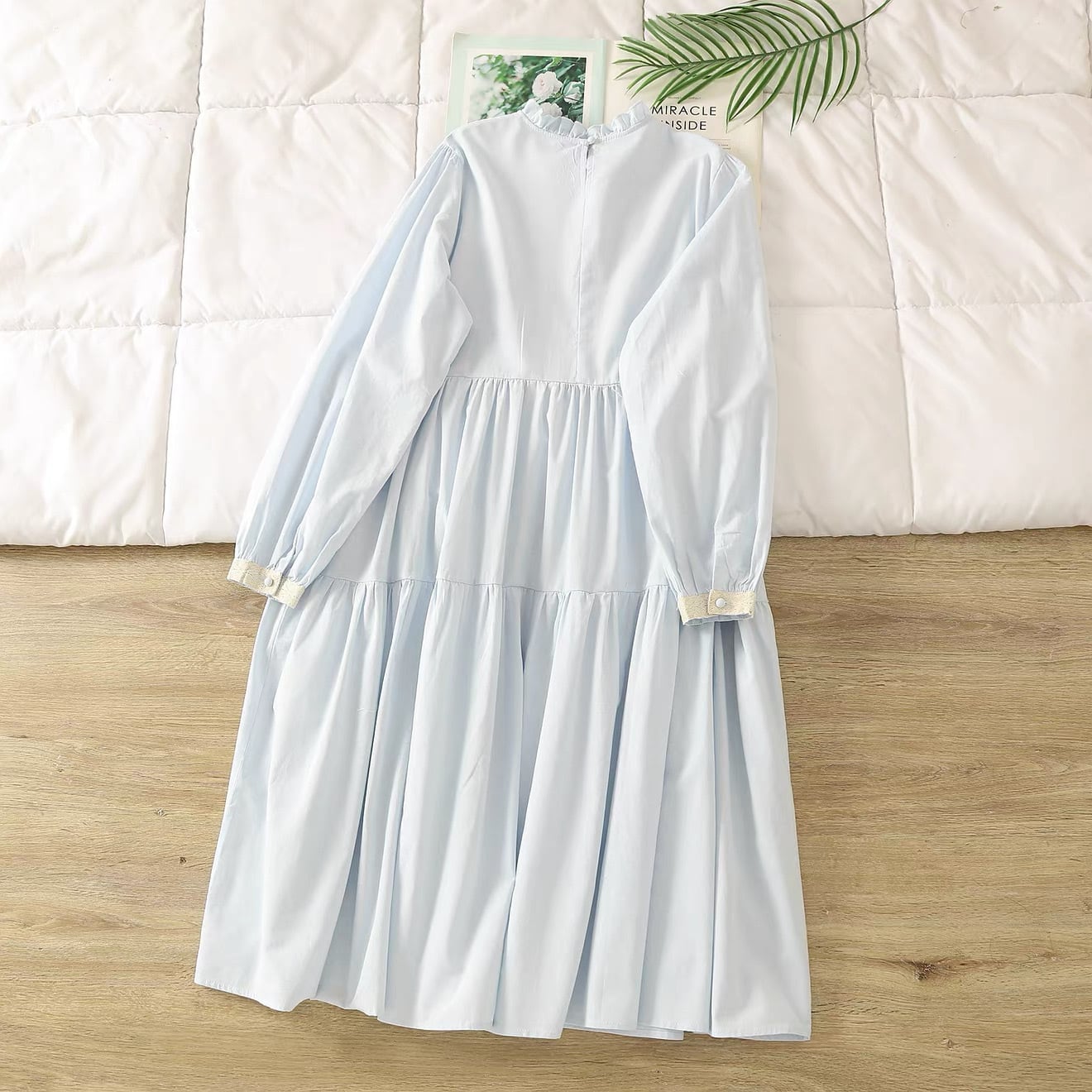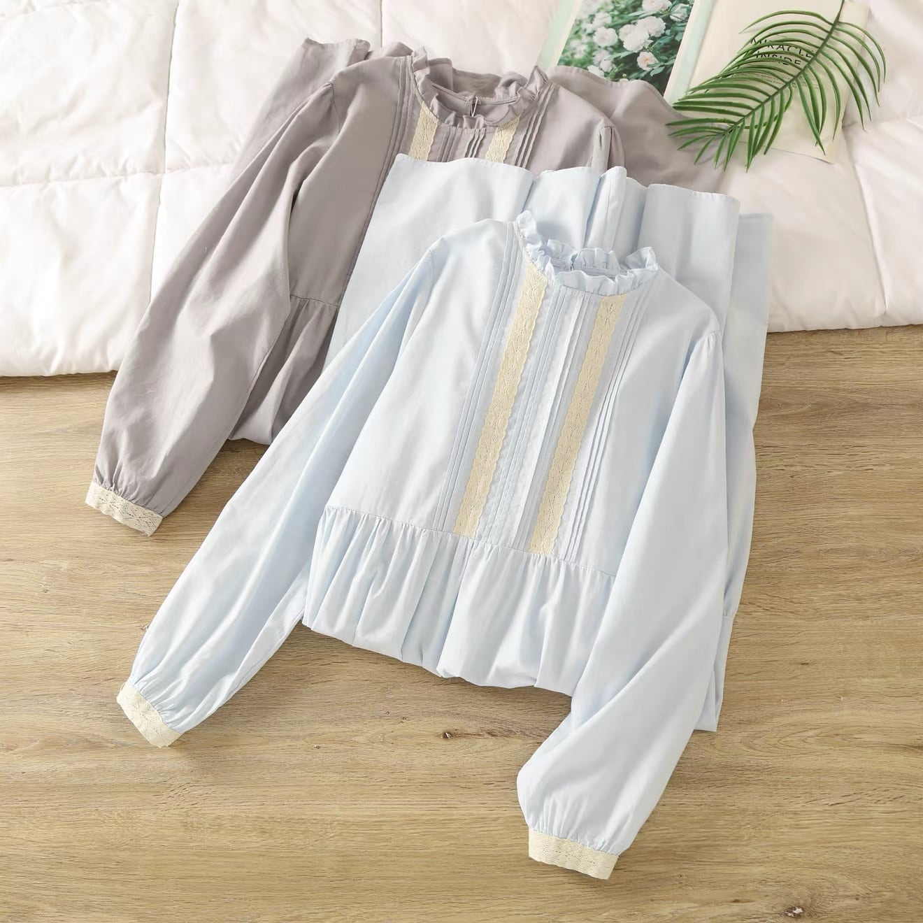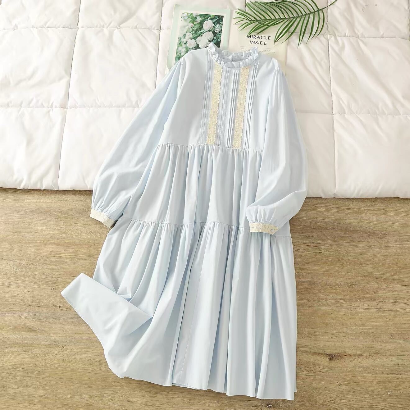 ウエスト位置で切り替えたティアードシルエットは、動くたびに自然な広がりが出て、コーディネートに奥行きを出してくれます。袖口にもレースをあしらい、細部まで統一感のあるデザインに仕上がっています。