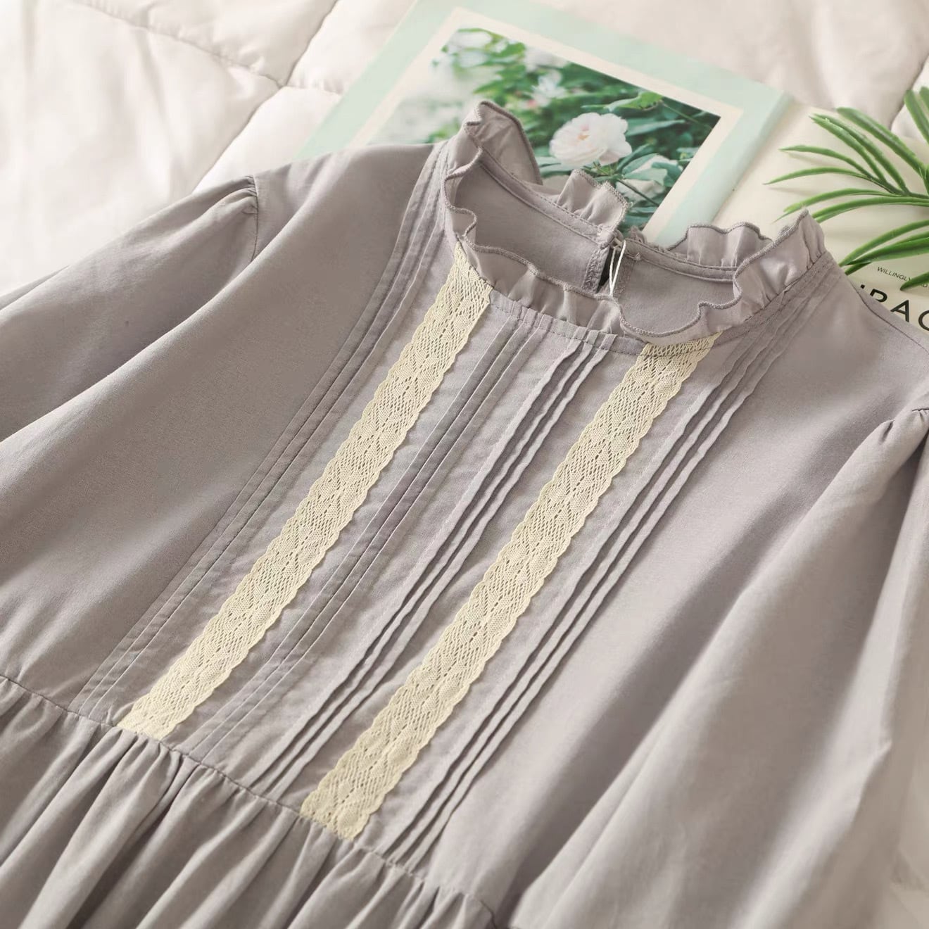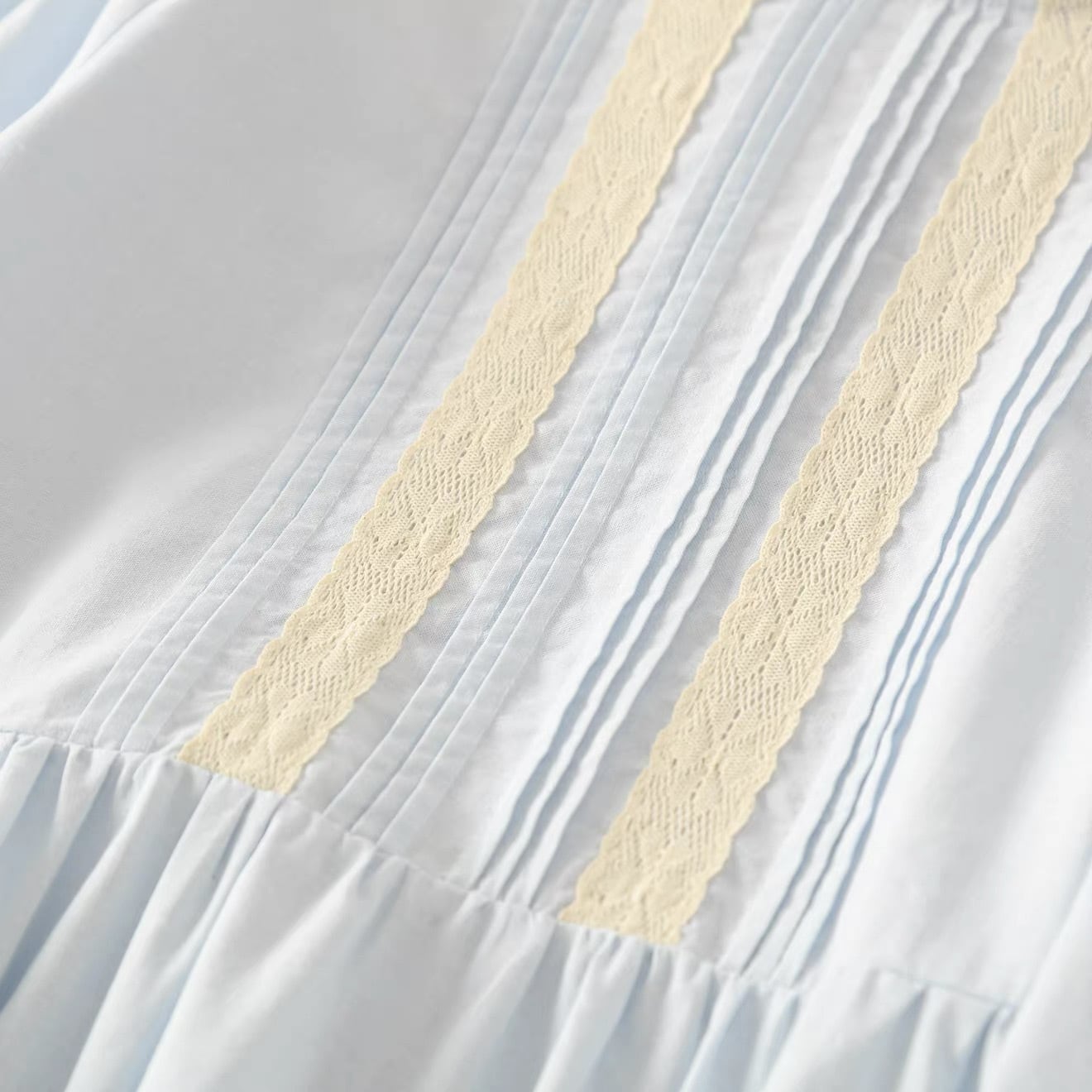 胸元に入った縦のピンタックとレースの切替が印象的な一枚。