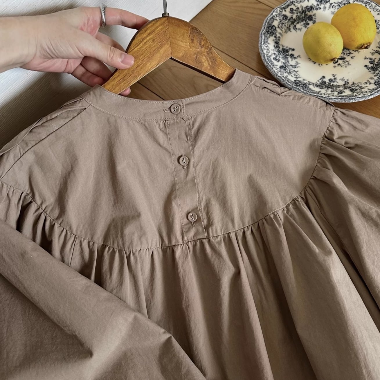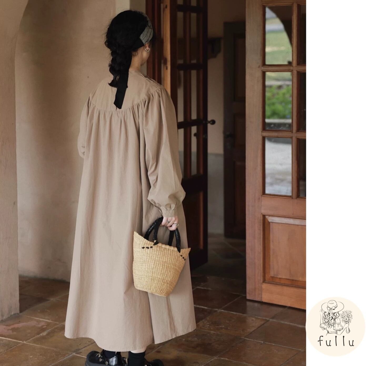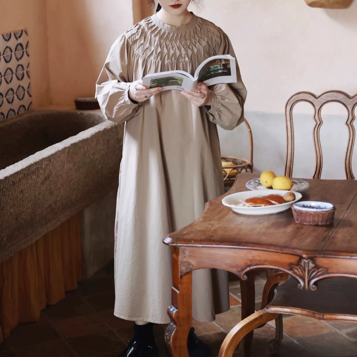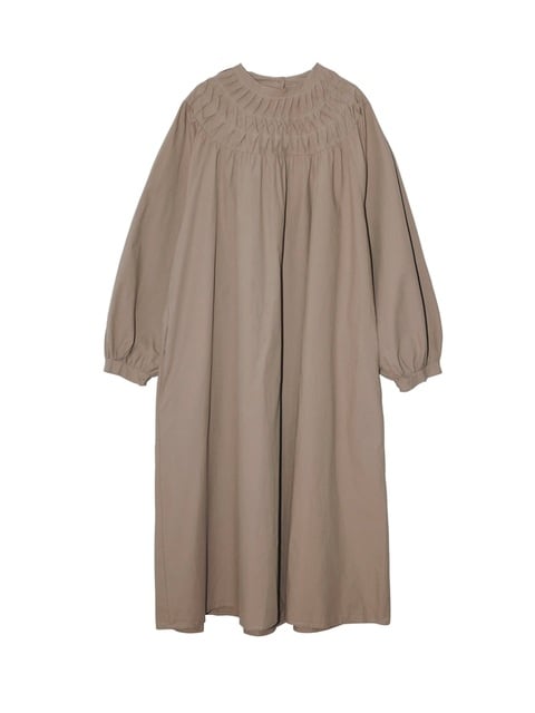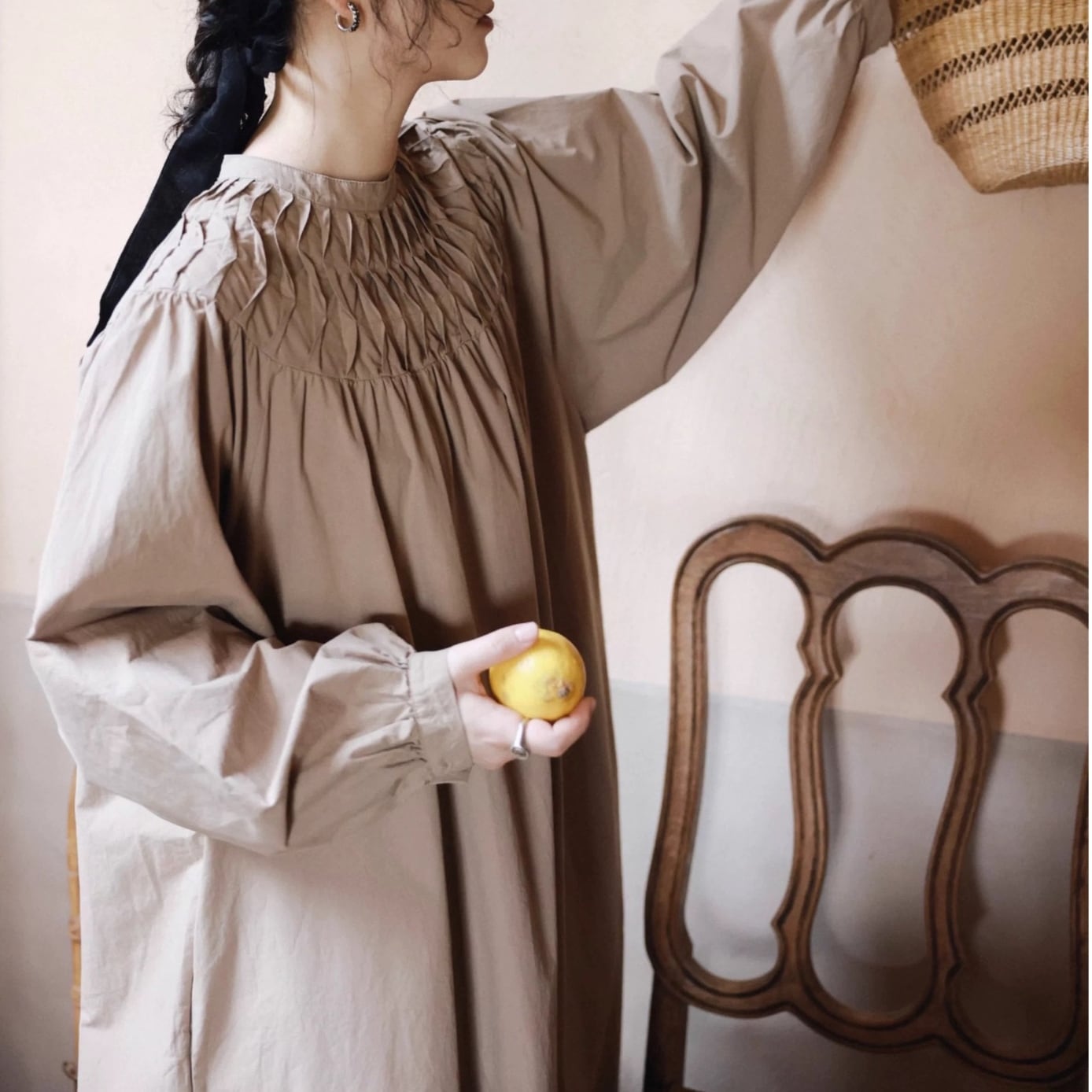 細やかなギャザーが首元を飾る、ゆったりとしたシルエットのワンピースドレス。落ち着いたベージュカラーで着るほどに肌に馴染みます。日常に溶け込む、洗練された一枚です。