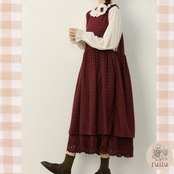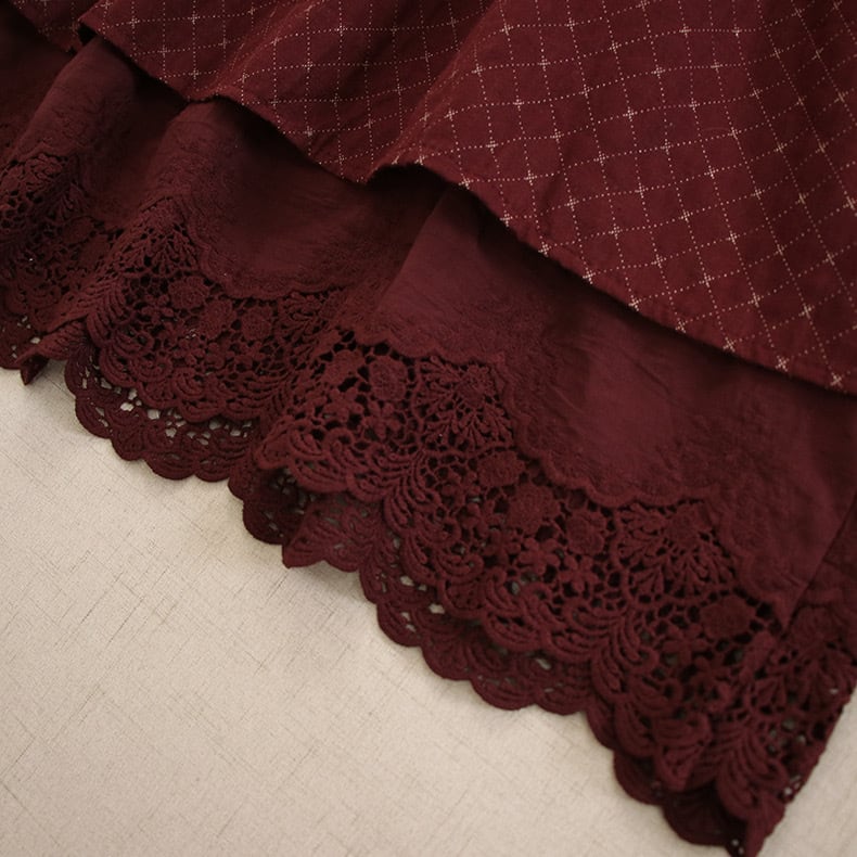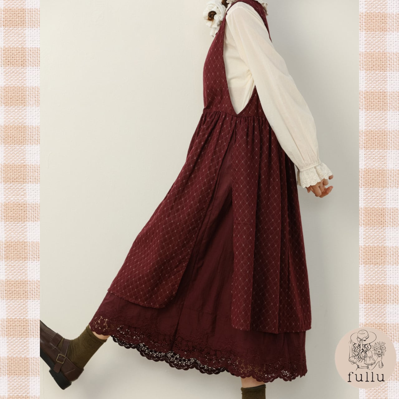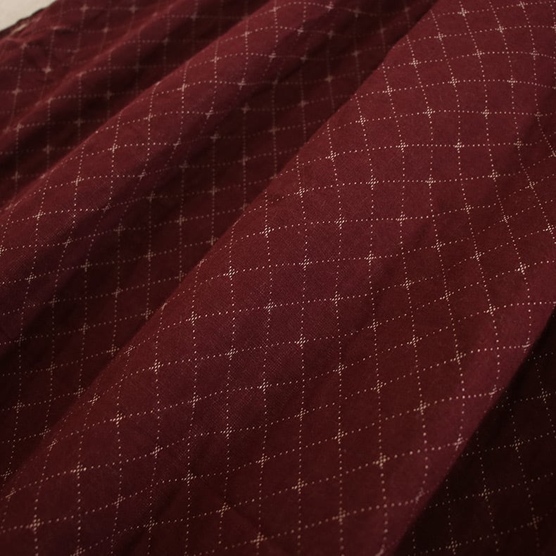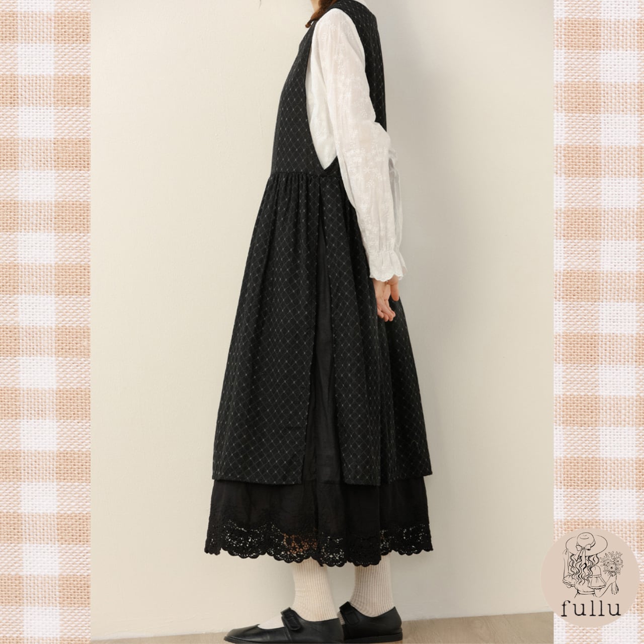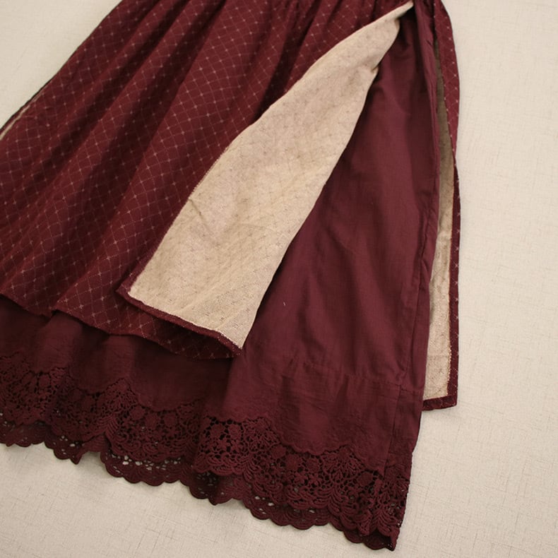さりげないダイヤ柄の織り模様と、裾からのぞくレースの重なりがクラシカルな雰囲気を演出します。