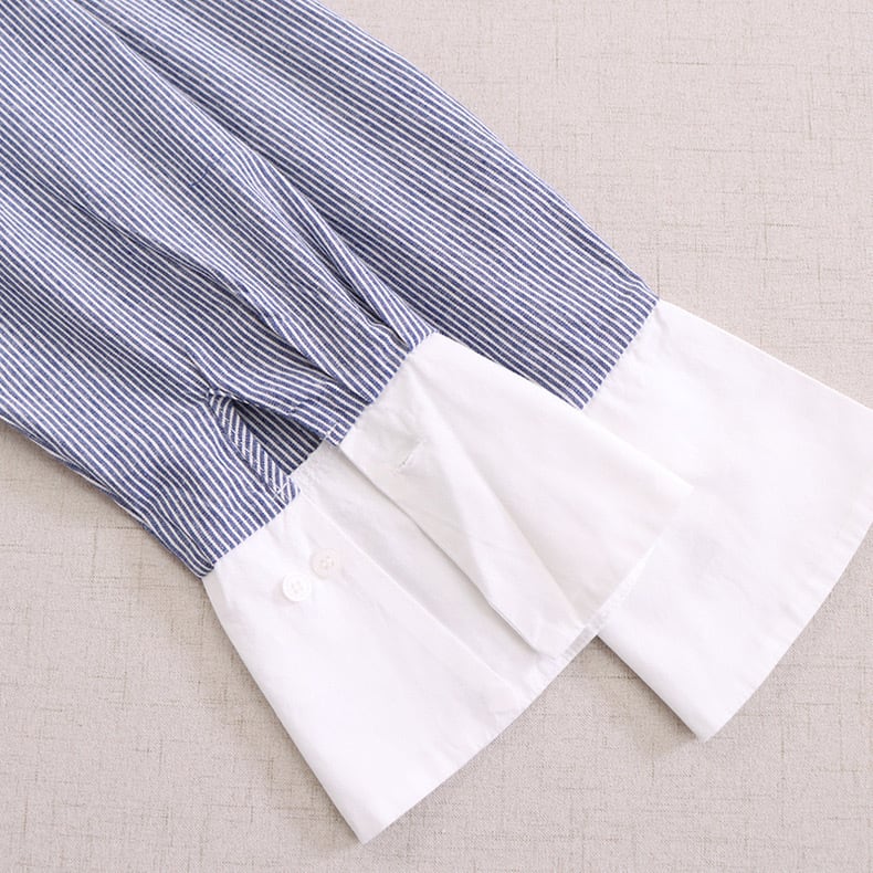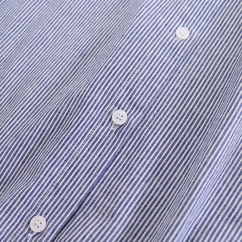 清楚で品のあるストライプ柄のロングシャツ。クラシックな襟とカフスのデザインが、落ち着いた大人のスタイルを引き立てます。