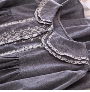 柔らかなレースと刺繍が、上品でクラシカルな雰囲気を演出します。可愛らしい丸襟デザインと袖口のシャーリングが女性らしさを引き立てるポイントに。