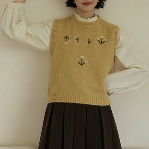 ミモザ刺繍ノースリーブニットベストトップス fu0518