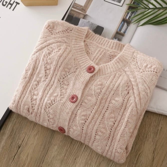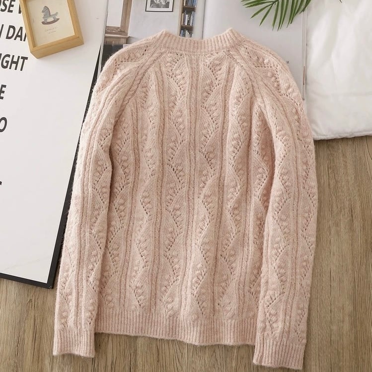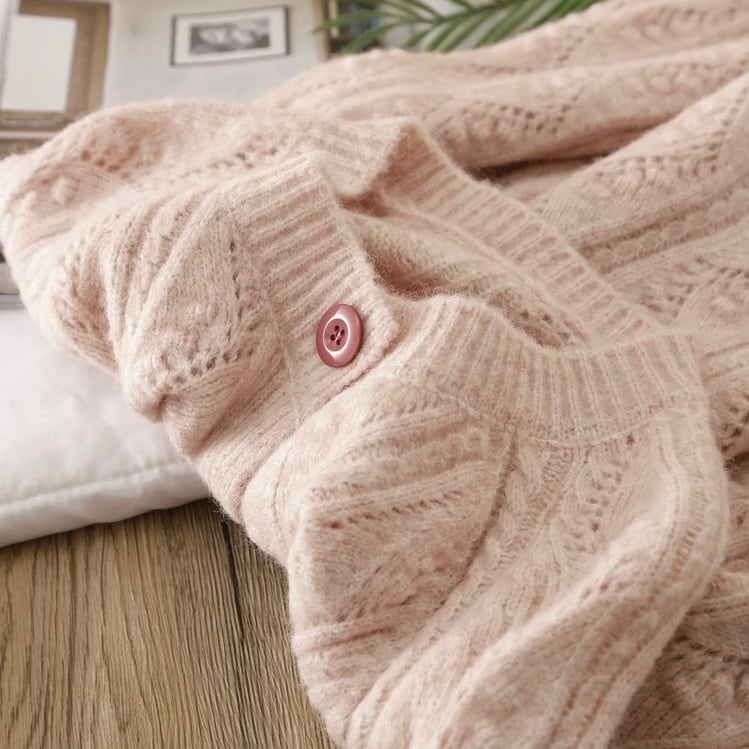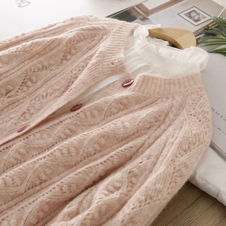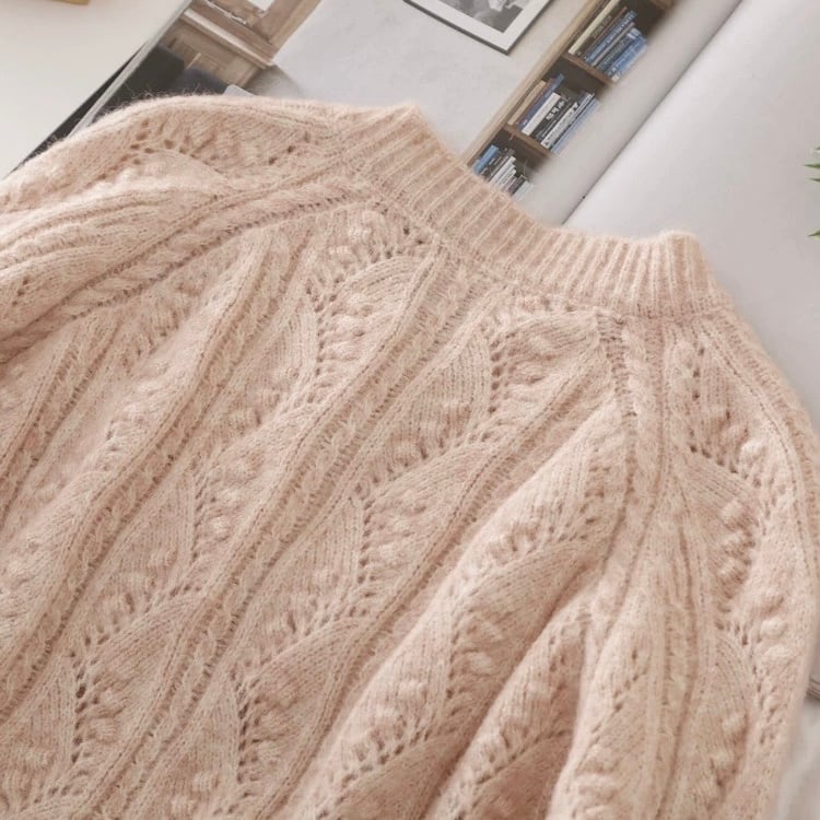 ふっくらとした編み模様と優しいベビーピンクのお色味がナチュラルで優しい雰囲気を演出します。