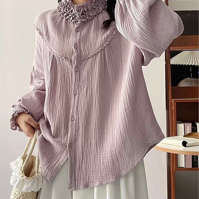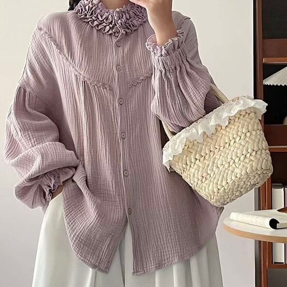 大ぶりなフリル襟が印象的なナチュラルテイストのブラウス。やわらかなガーゼ調の生地感が特徴で、軽やかで心地よい着心地を叶えます。袖口やヨーク部分にはレース調の装飾が施され、さりげない可愛らしさをプラス。