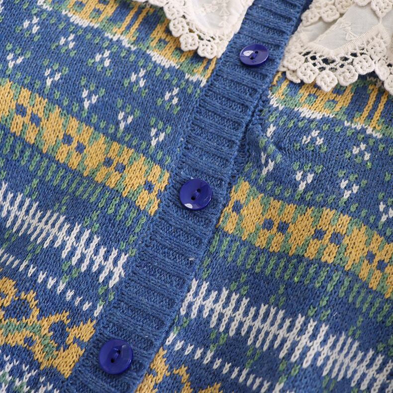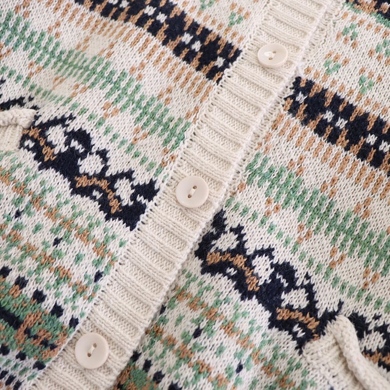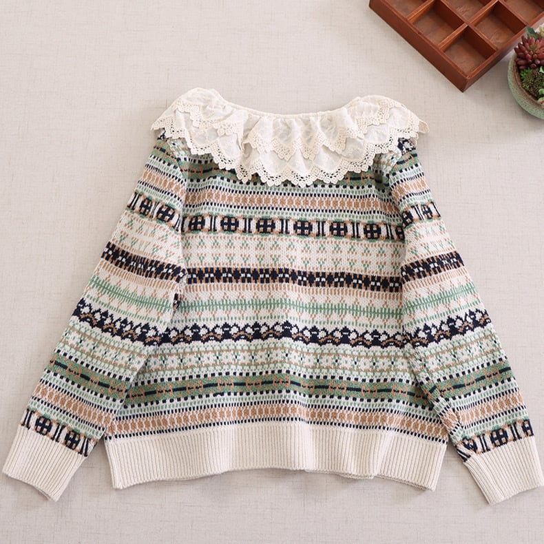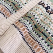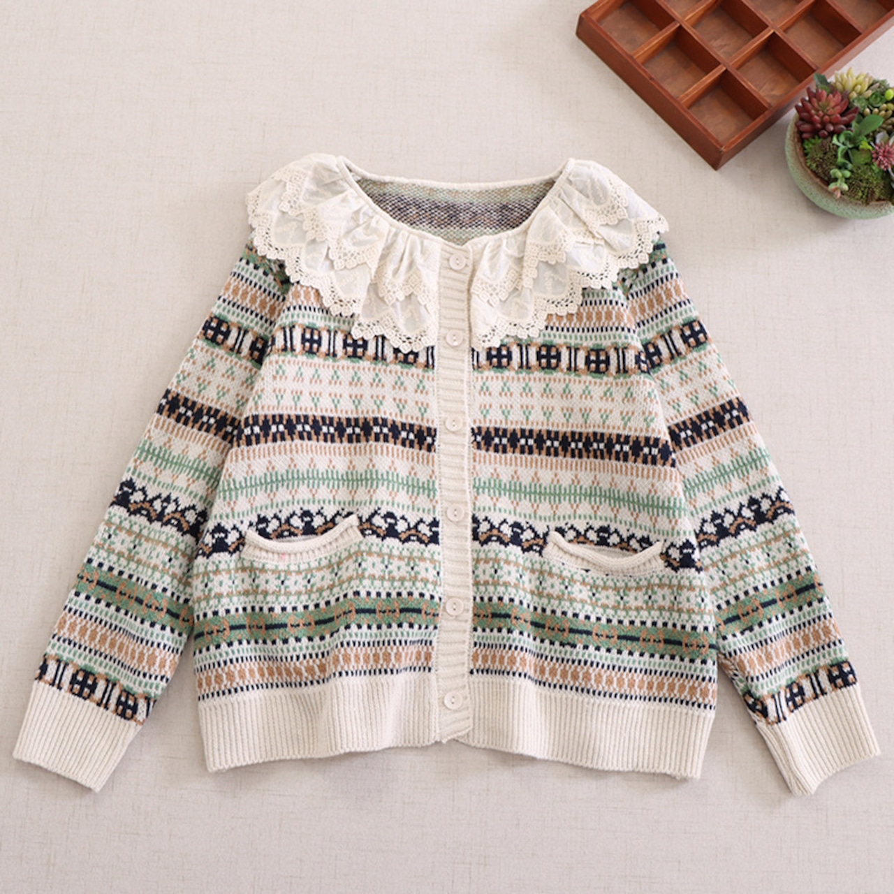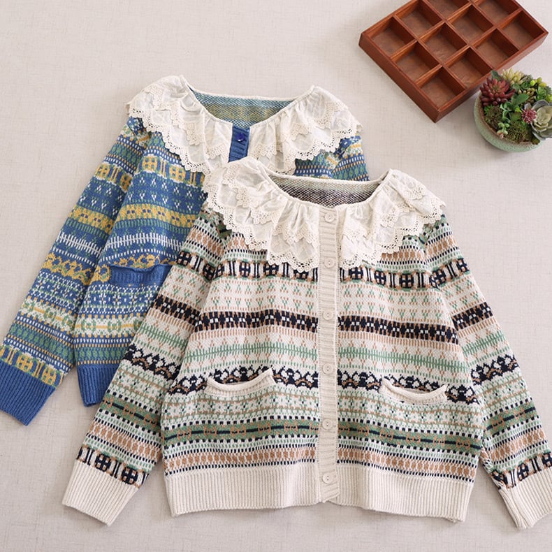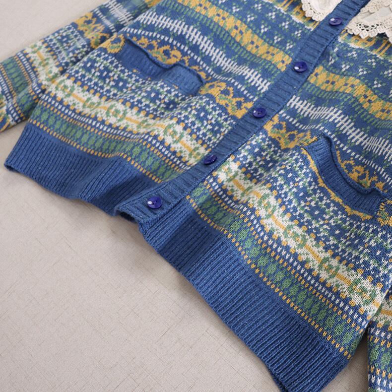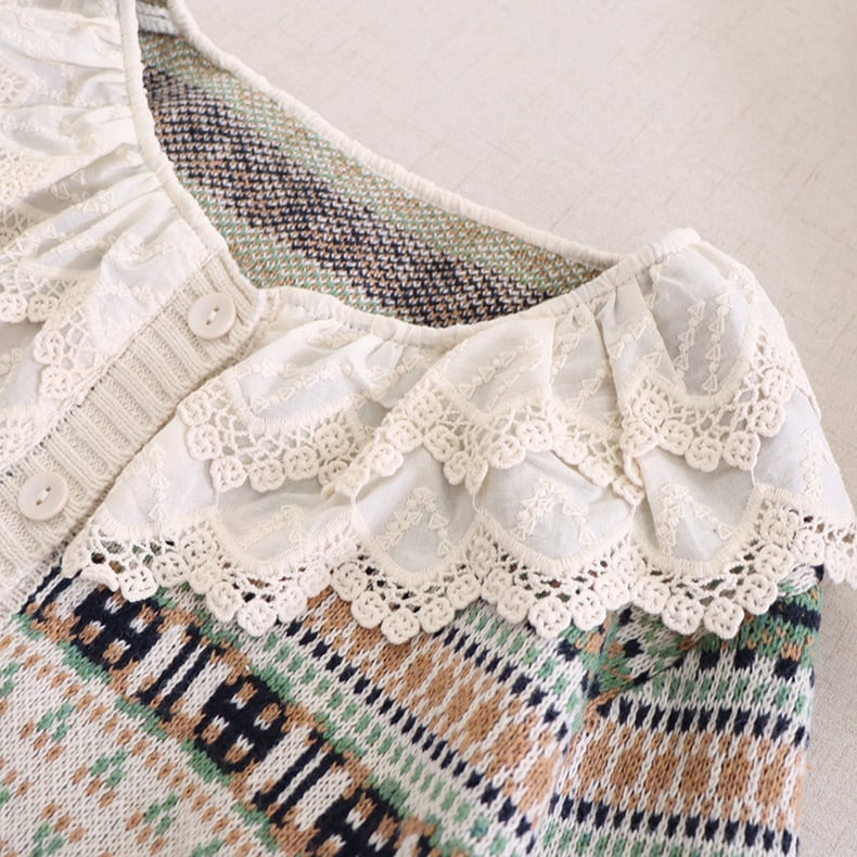 首元の大きなフリルと総柄のボーダーがポイントのカーディガン。個性をだしつつも、落ち着いたお色味なので
