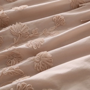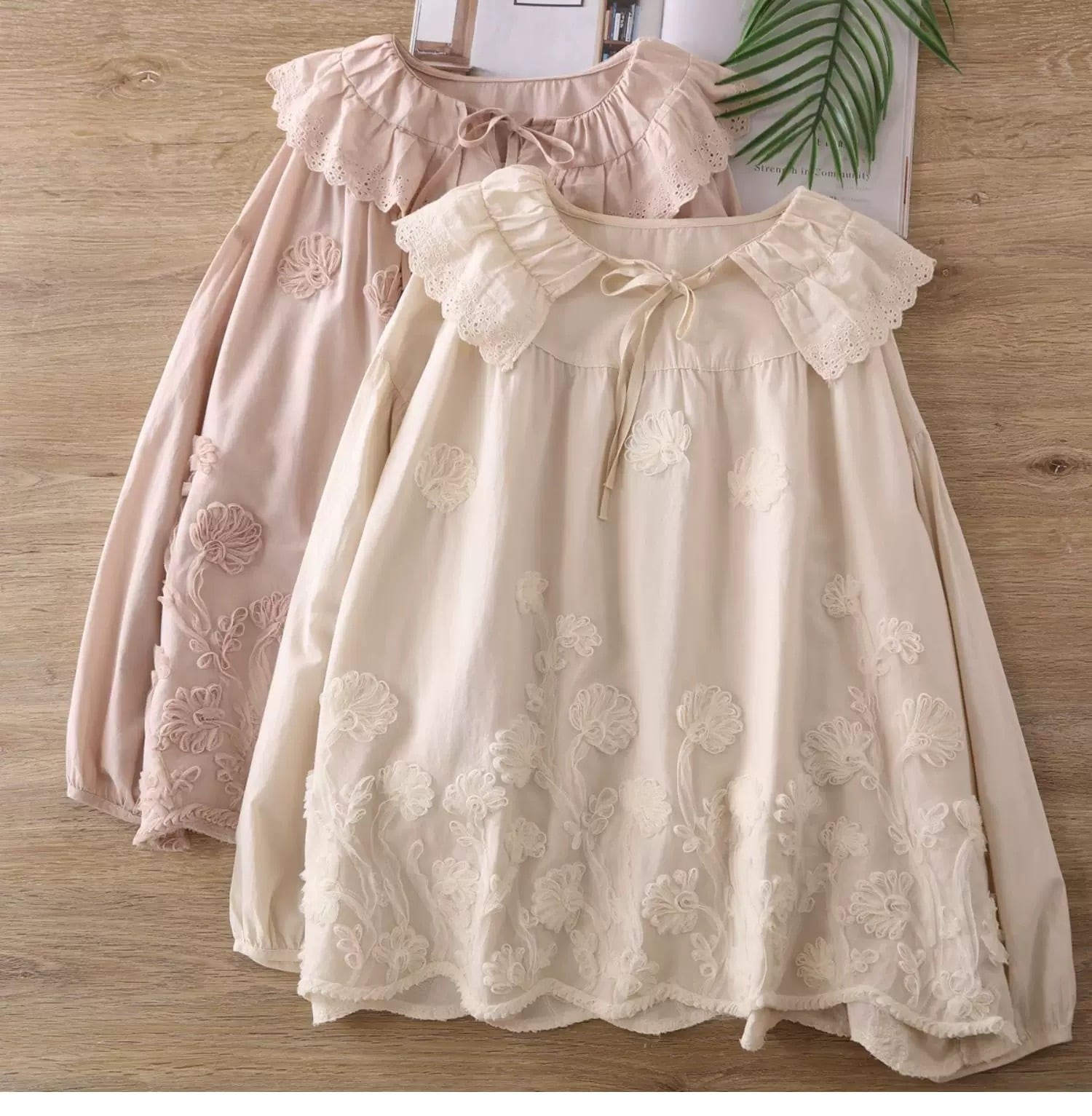 ふんわりと広がるシルエットに、お花のレース刺繍をあしらったナチュラルなブラウス。大きめのフリルカラーがアクセントになり、首元のリボンで可愛らしさをプラス。軽やかな生地感で、季節を問わず重ね着もしやすい一枚です。ナチュラルカントリーコーデにもぴったり。