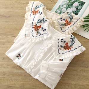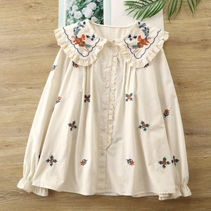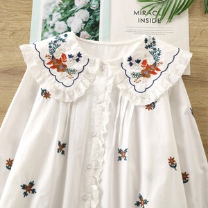 大きめのフリル襟に、フラワー刺繍が施されたナチュラルカントリーなブラウス。身頃にも小花の刺繍が散りばめられ、やさしい雰囲気に仕上がっています。