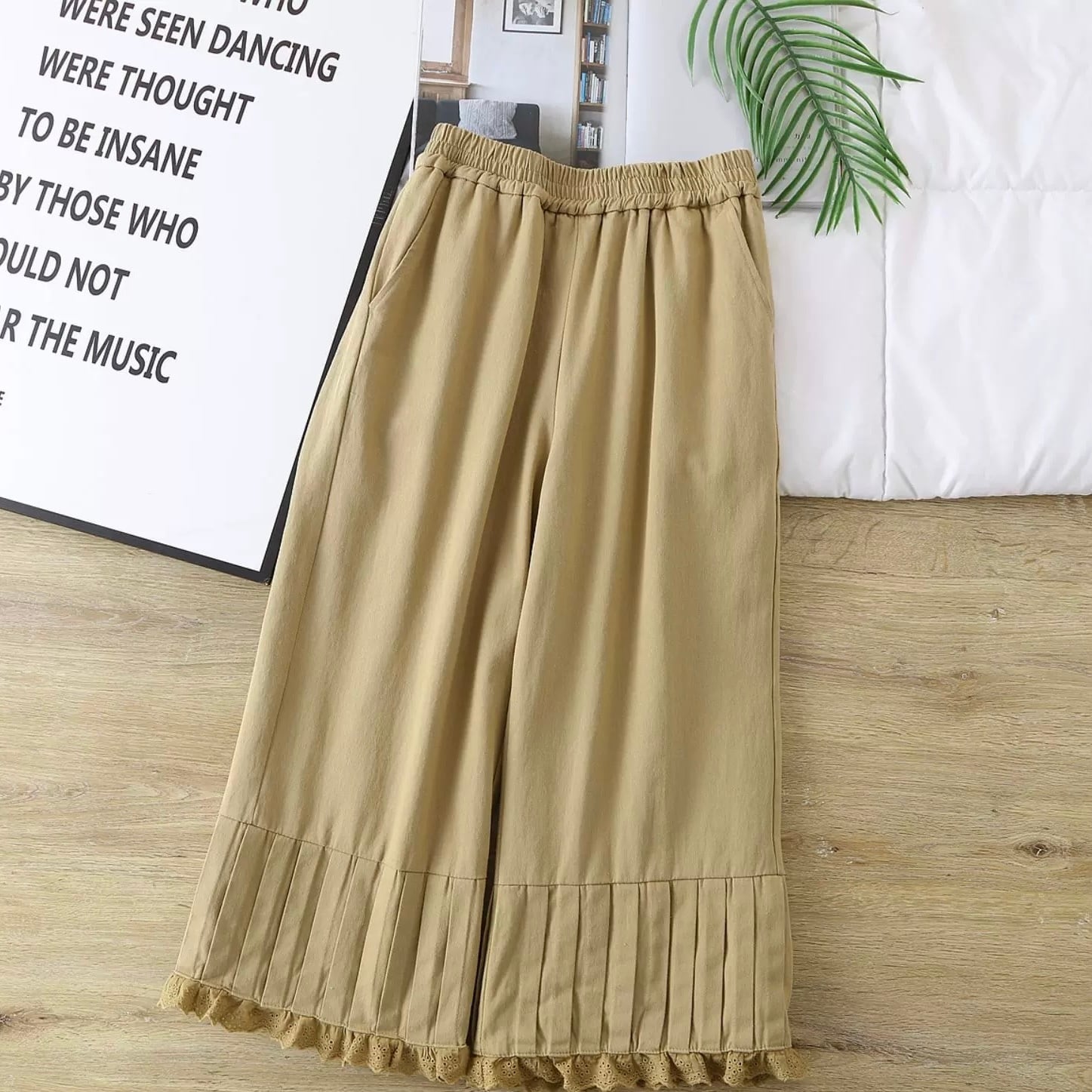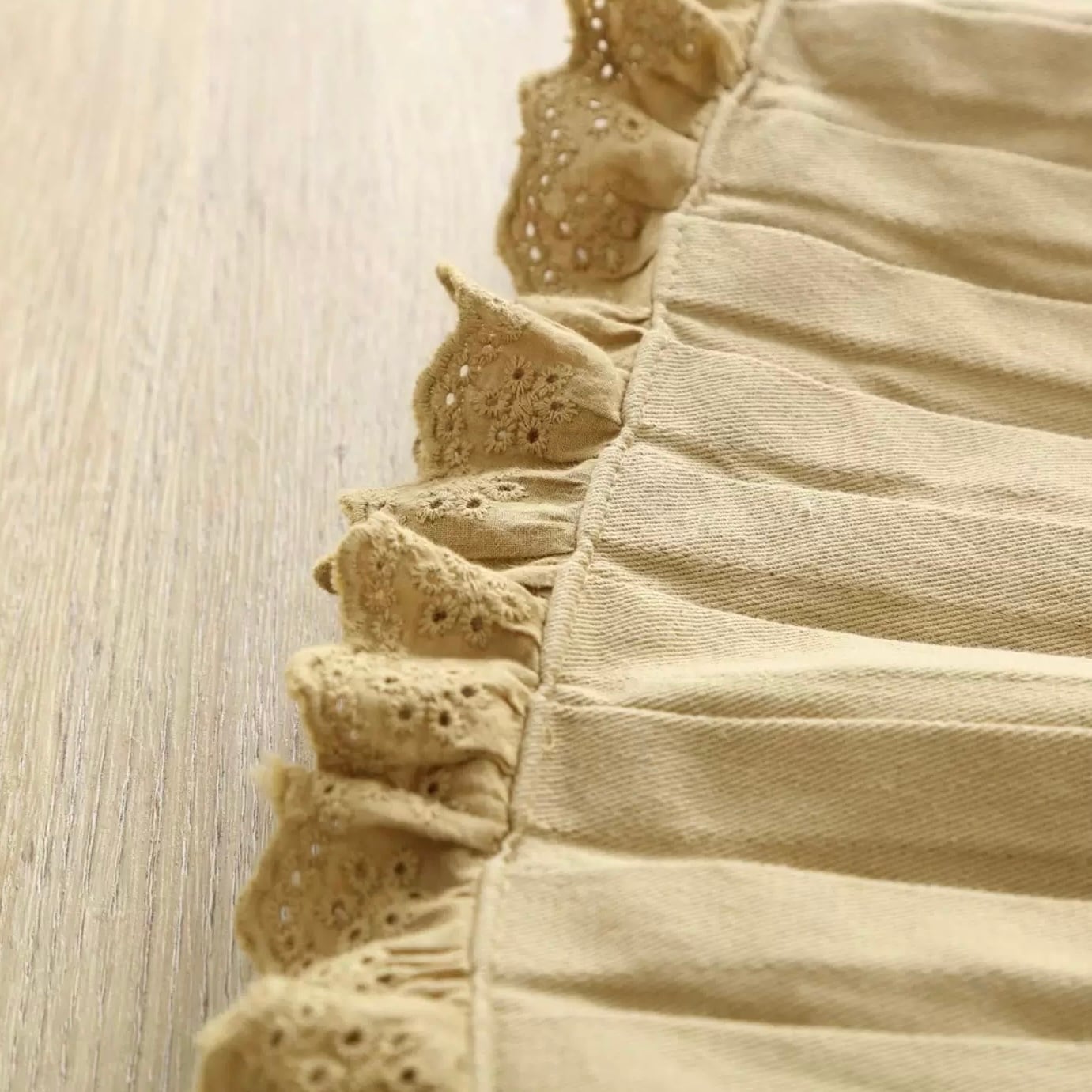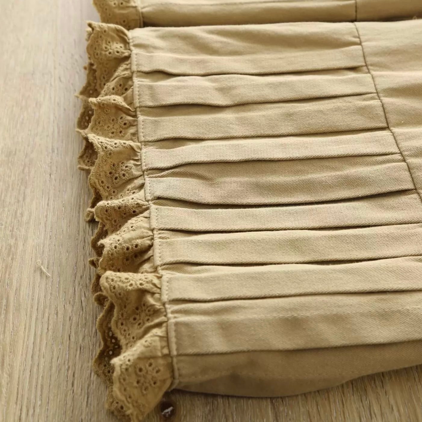 裾にプリーツ加工とレースをあしらい、大人ナチュラルなアクセントをプラスしました。内側はふんわり暖かな裏ボア仕様で、寒い季節にも快適に過ごせます。ウエストはゴム仕様でリラックス感たっぷり。ナチュラルコーデやレイヤードスタイルにぴったりの一枚です。