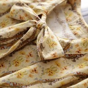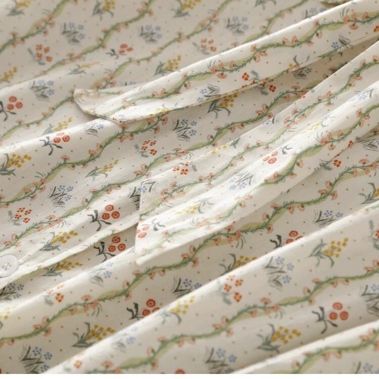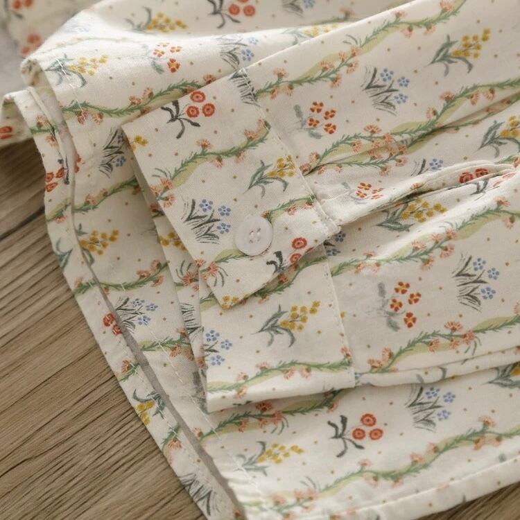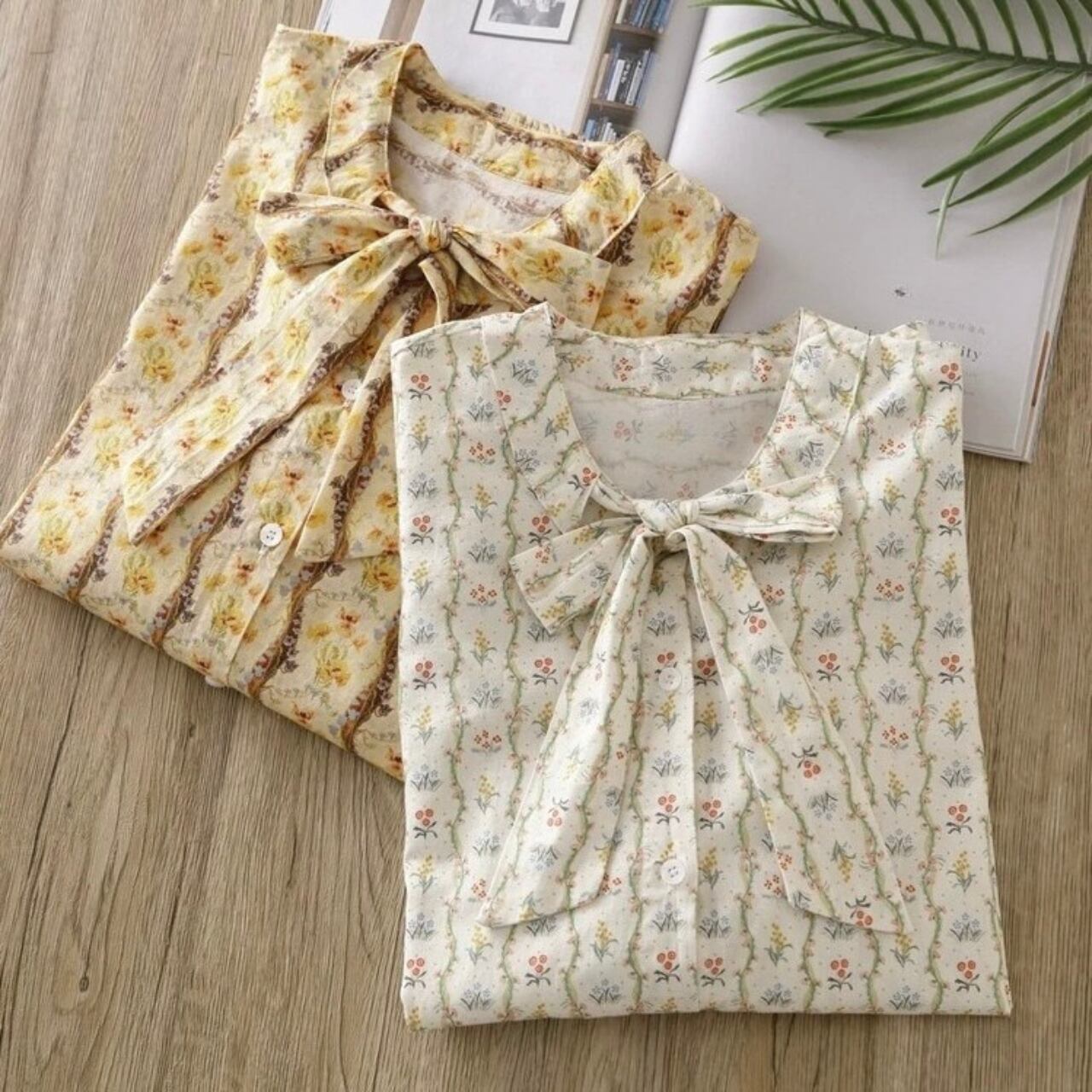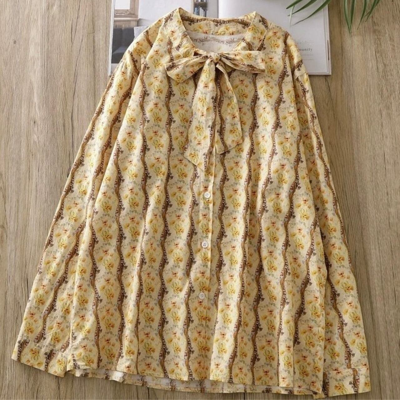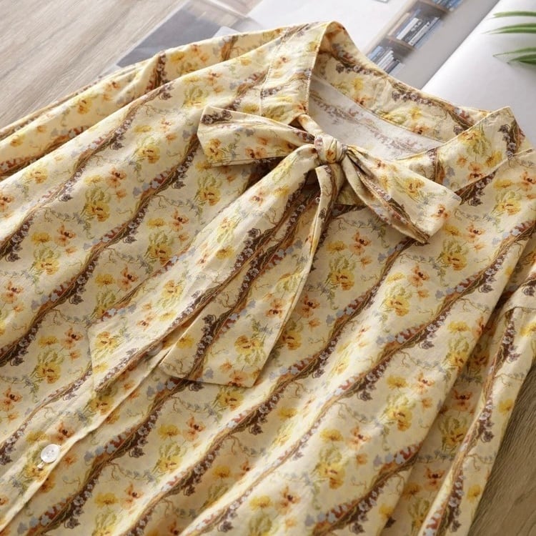 レトロなフラワープリントが魅力のボウタイブラウス。首元のリボンが華やかさをプラスします。