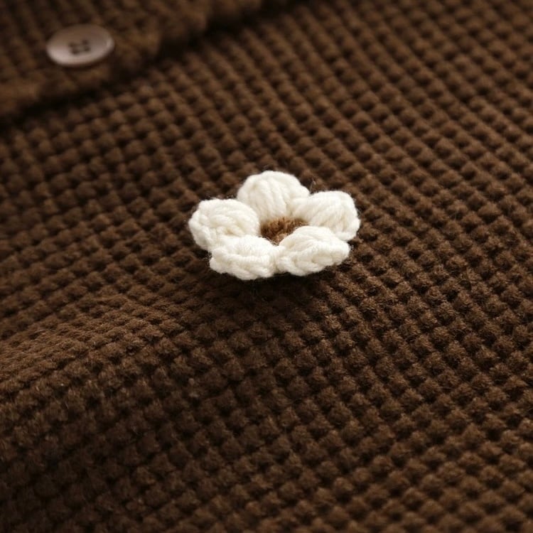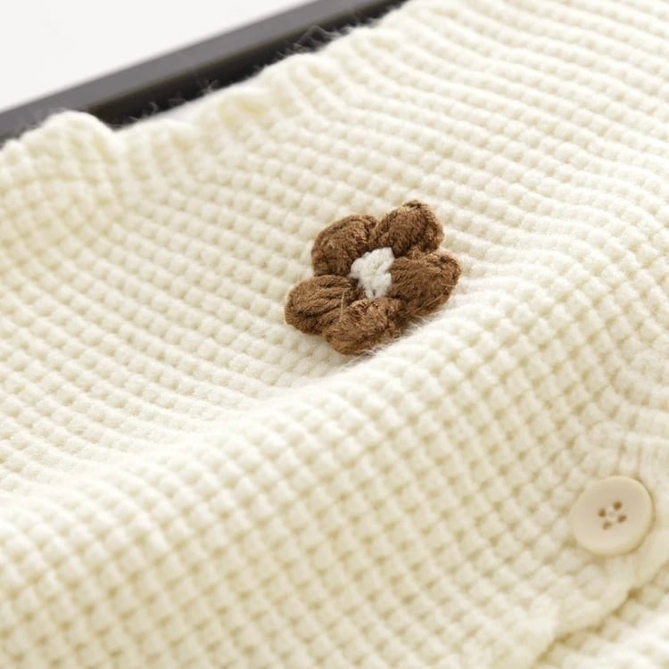 フロントには、ちょこんと立体的に編み込まれたお花のモチーフが散りばめられ、ほっこりとした可愛らしさを演出。