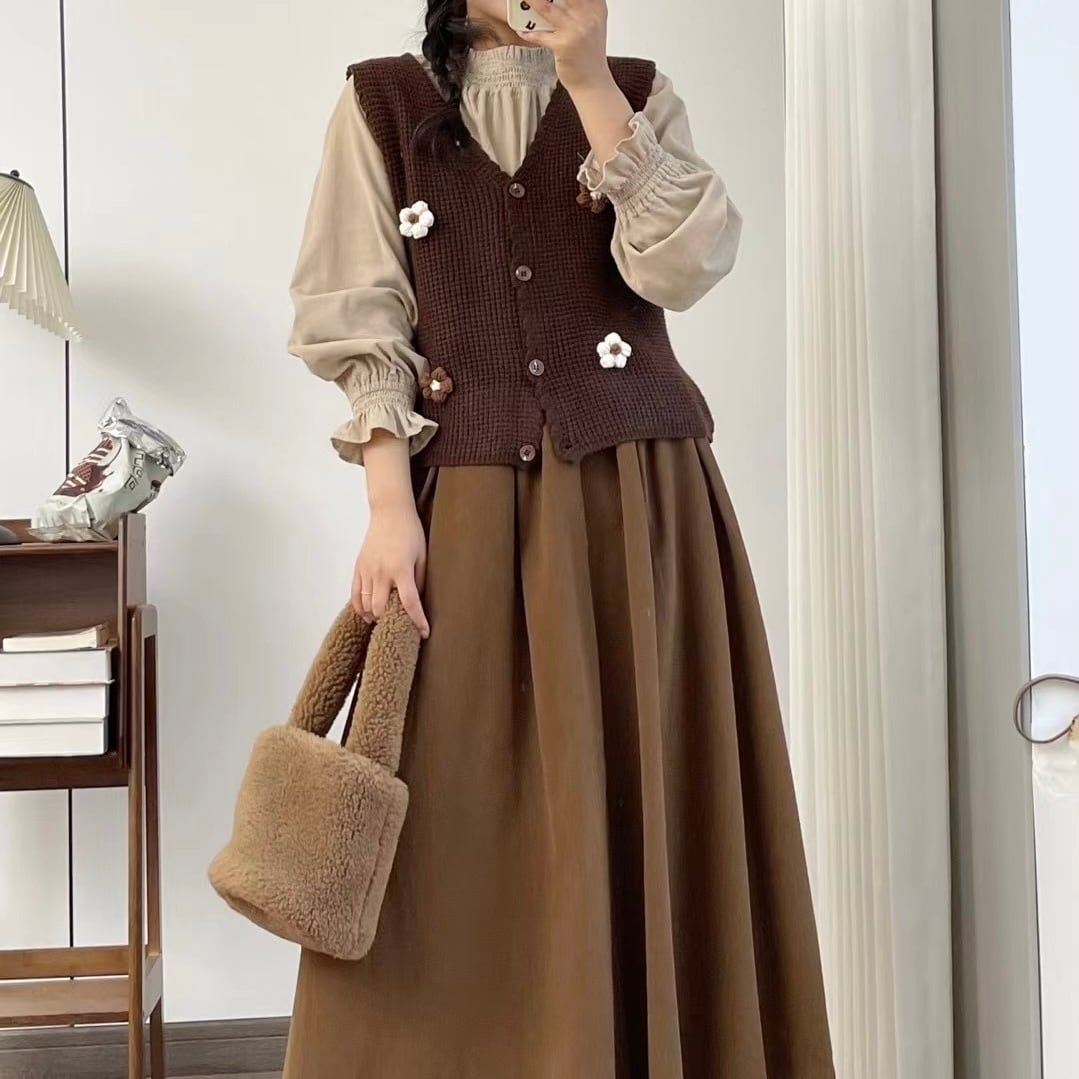 ブラウスやカットソーの上に重ねるだけで、あたたかみのあるナチュラルコーデが完成します。