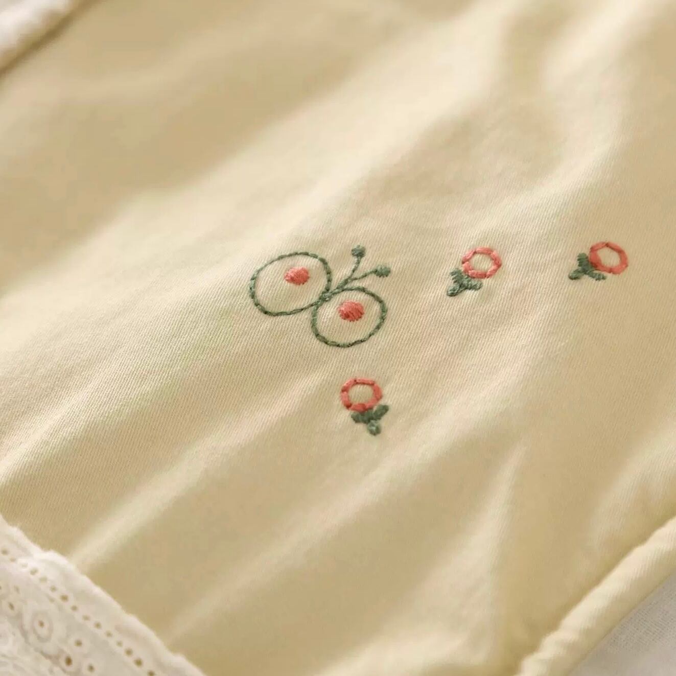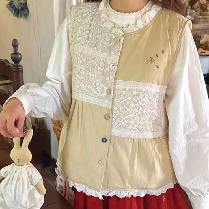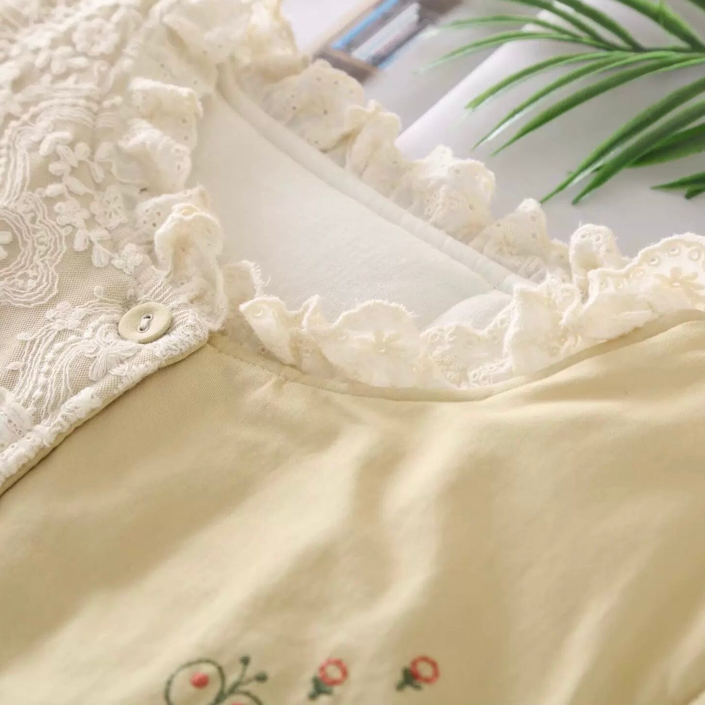 やわらかな色合いと小さな刺繍が可愛らしく、ナチュラルな雰囲気を演出します。襟元と裾のフリルがさりげないアクセントに。前ボタン仕様でさっと羽織れ、防寒対策にもおすすめです。