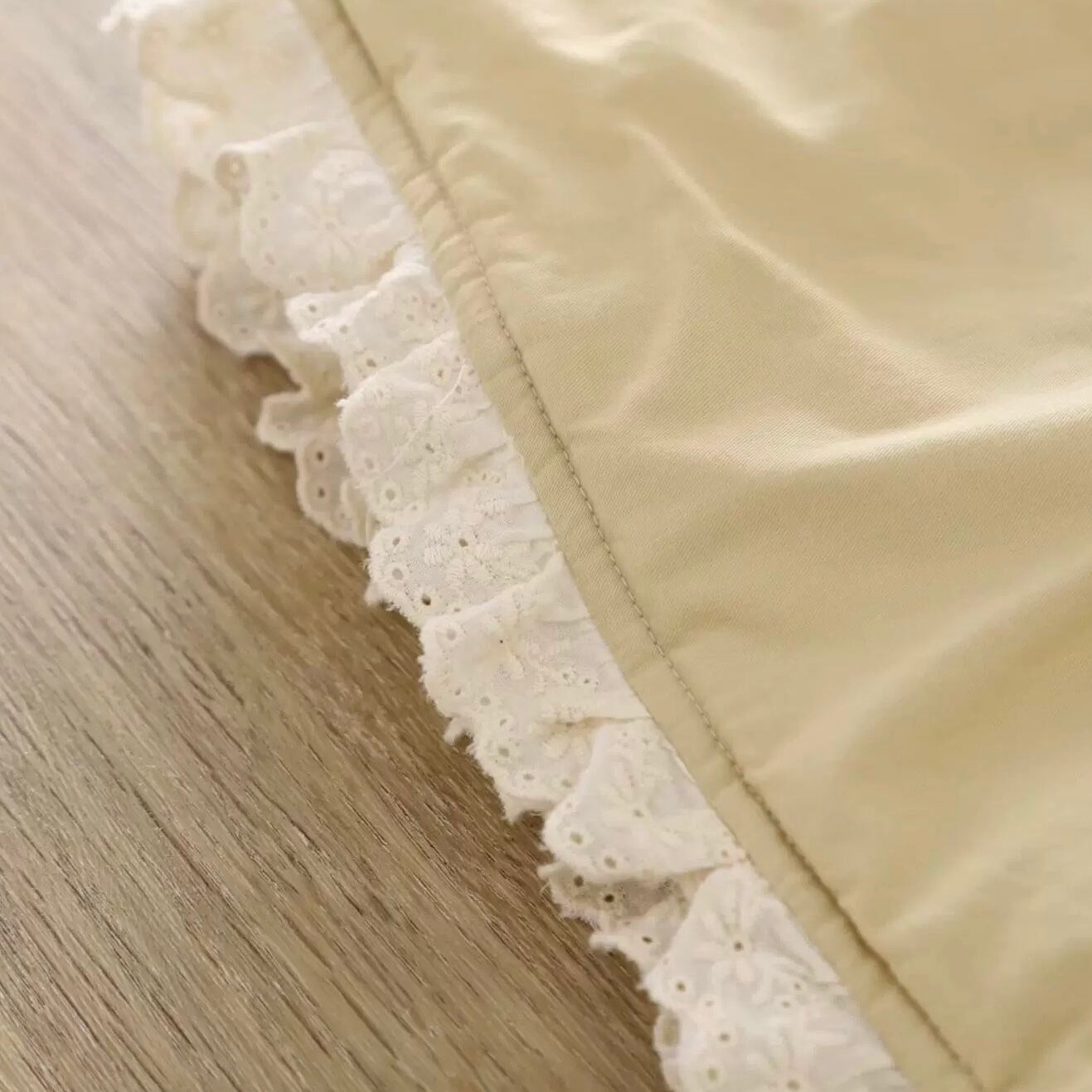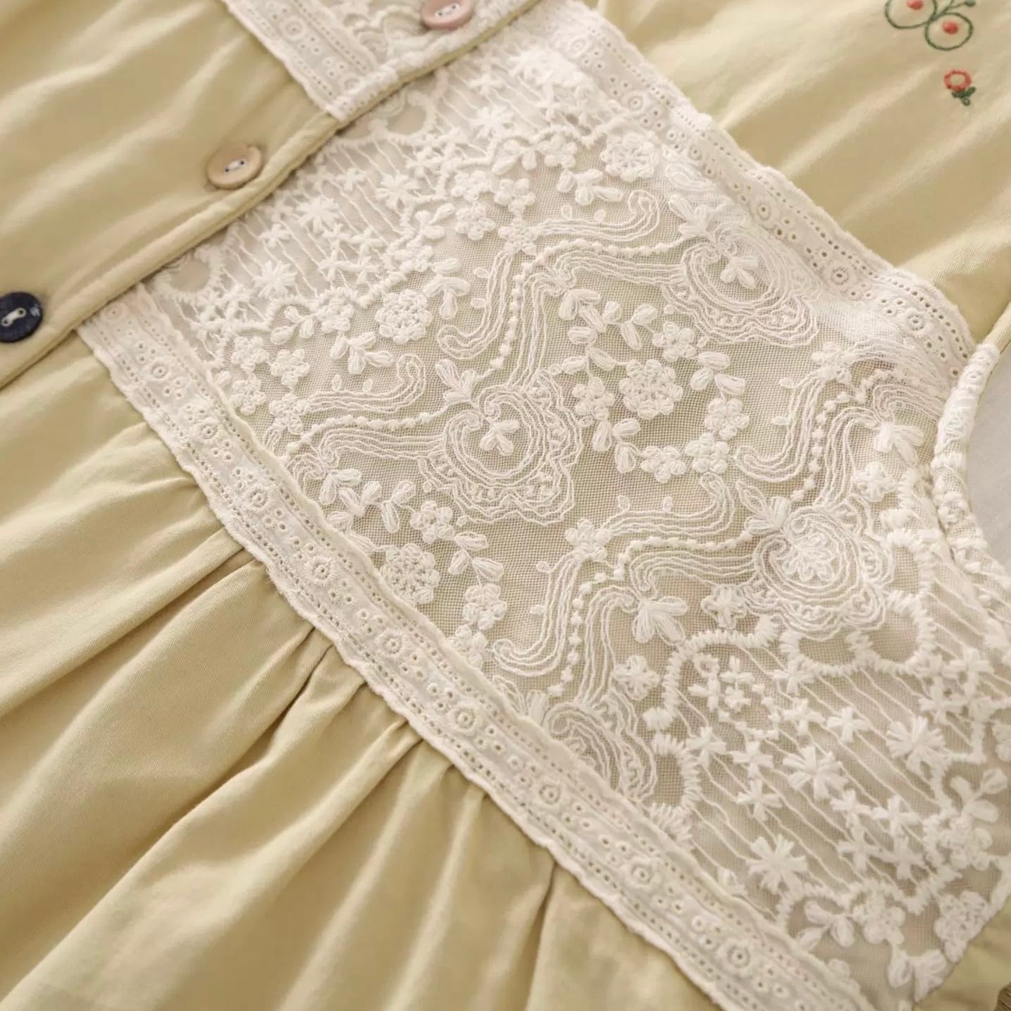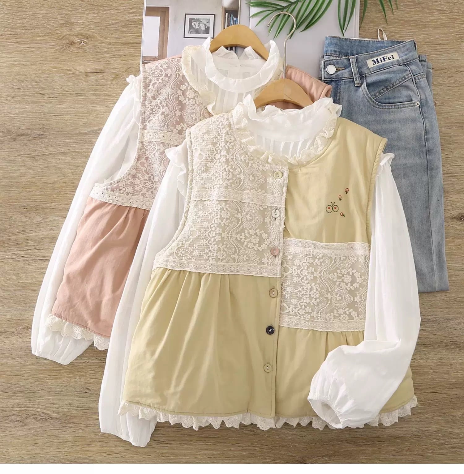 やわらかな色合いと小さな刺繍が可愛らしく、ナチュラルな雰囲気を演出します。襟元と裾のフリルがさりげないアクセントに。前ボタン仕様でさっと羽織れ、防寒対策にもおすすめです。
